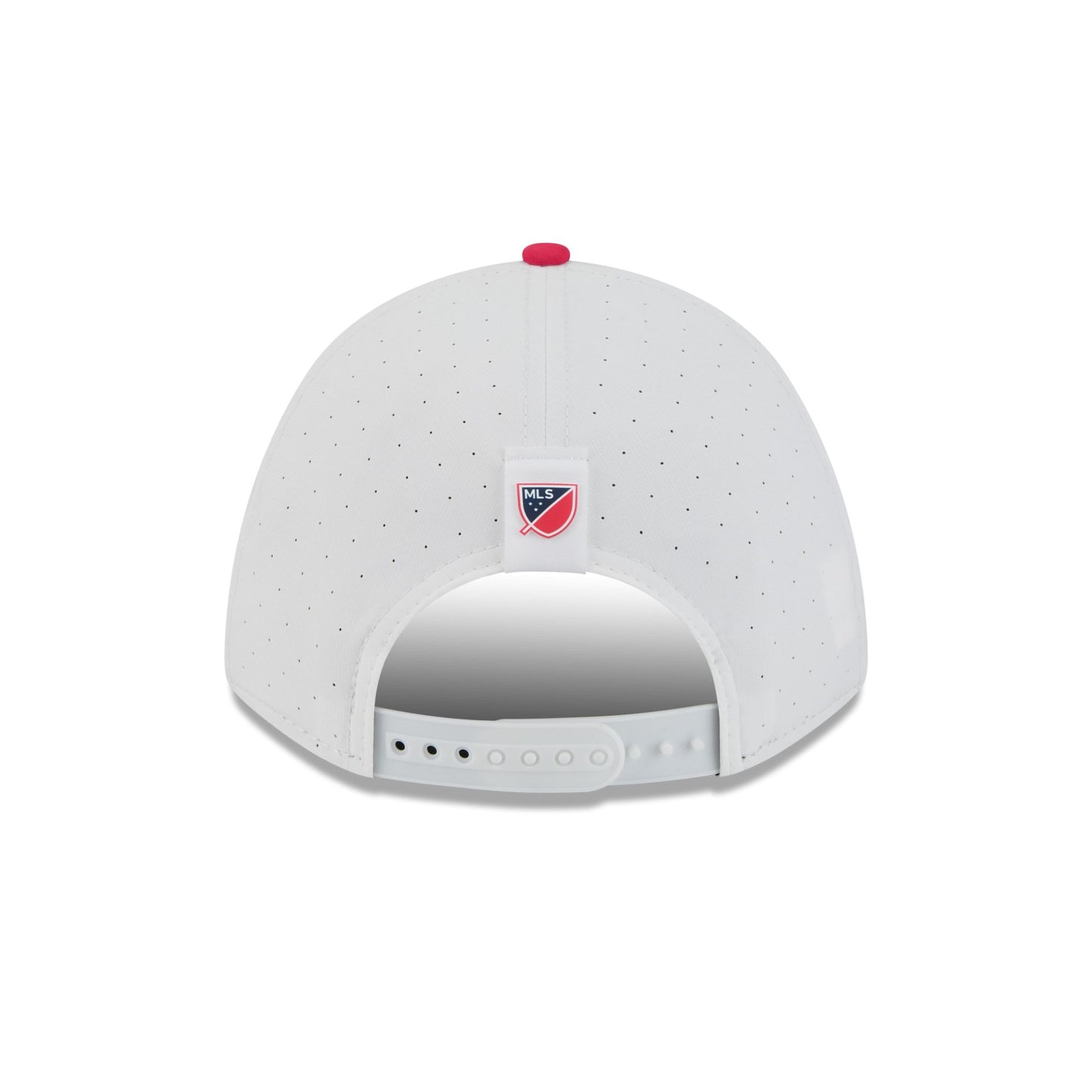 The St. Louis City SC 2026 MLS Kickoff 9FORTY M-Crown A-Frame Snapback features a stitch-down silicone St. Louis City SC logo patch at the front panel with a matching woven MLS Shield tag above a snapback closure at the rear. Additional details include a quill tech performance fabrication with a pink visor accented with team color stripes at the front.