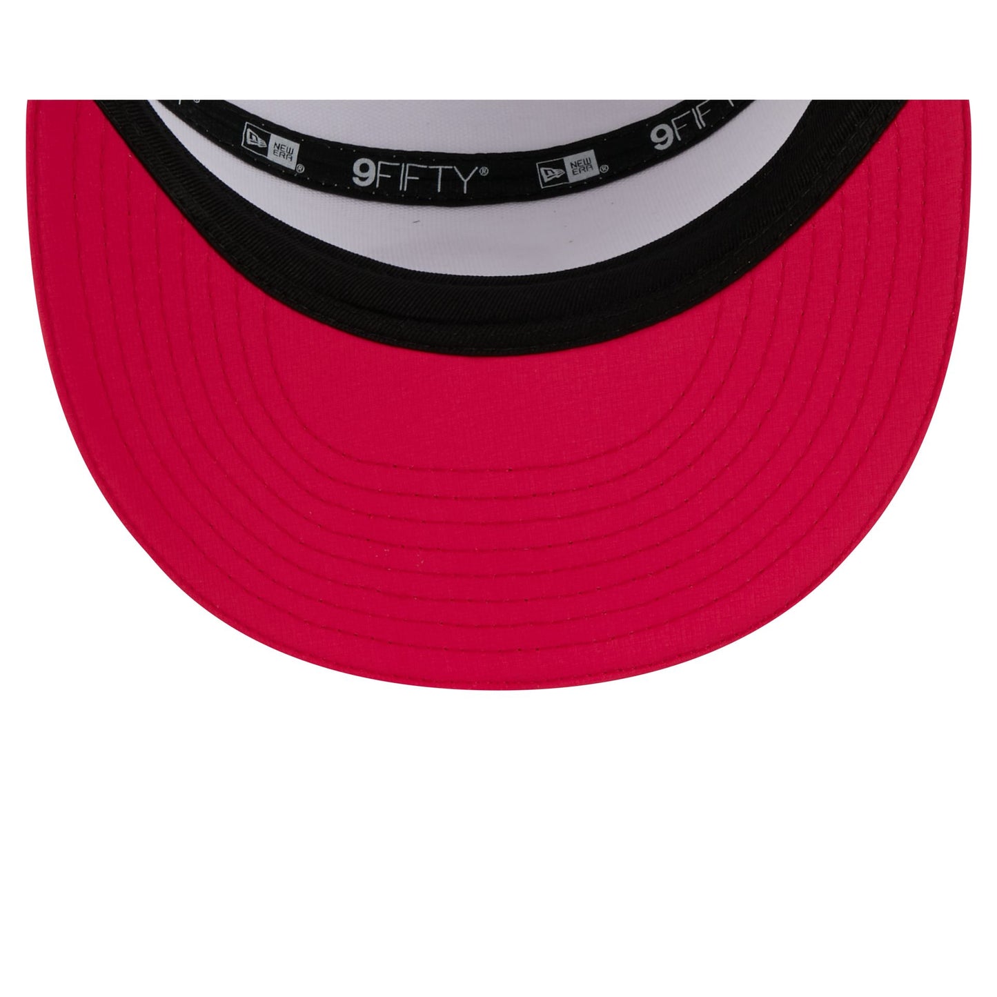 The St. Louis City SC 2026 MLS Kickoff Split Panel 9FIFTY Snapback features a stitch-down silicone St. Louis City SC logo patch at the front panel with a matching woven MLS Shield tag above a snapback closure at the rear. Additional details include a quill tech performance fabrication with a pink visor accented with team color stripes at the front.