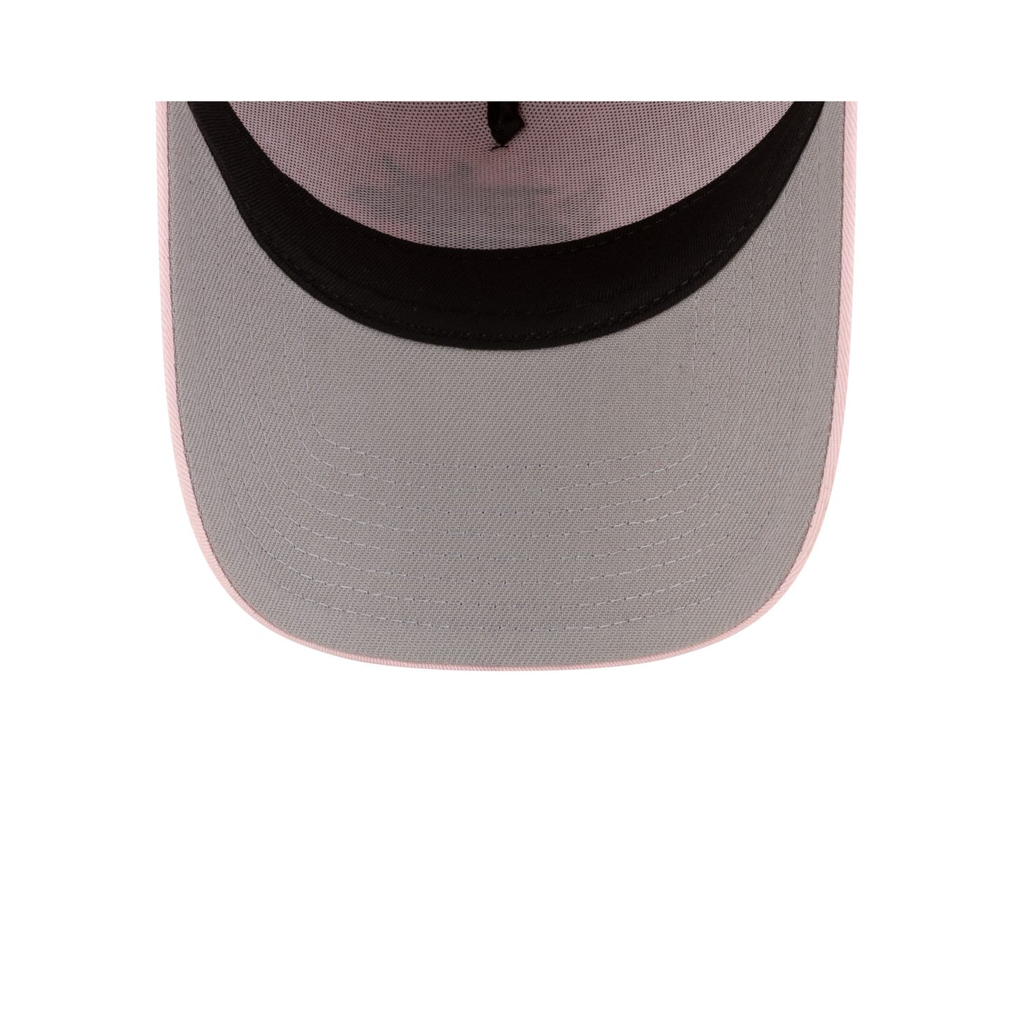 The Stranger Things Hellfire Club Pink 9FORTY A-Frame Snapback features an embroidered Stranger Things Hellfire Club heart graphic at the front panels with a Strangers Things logo above an adjustable snapback closure at the rear and a gray undervisor.