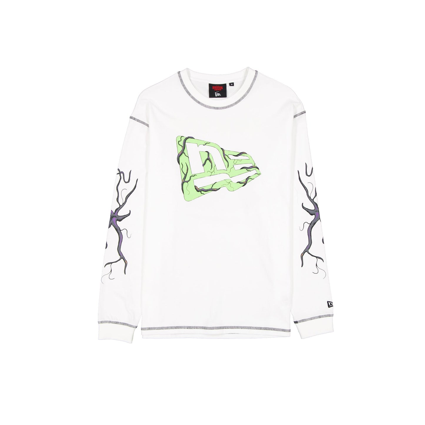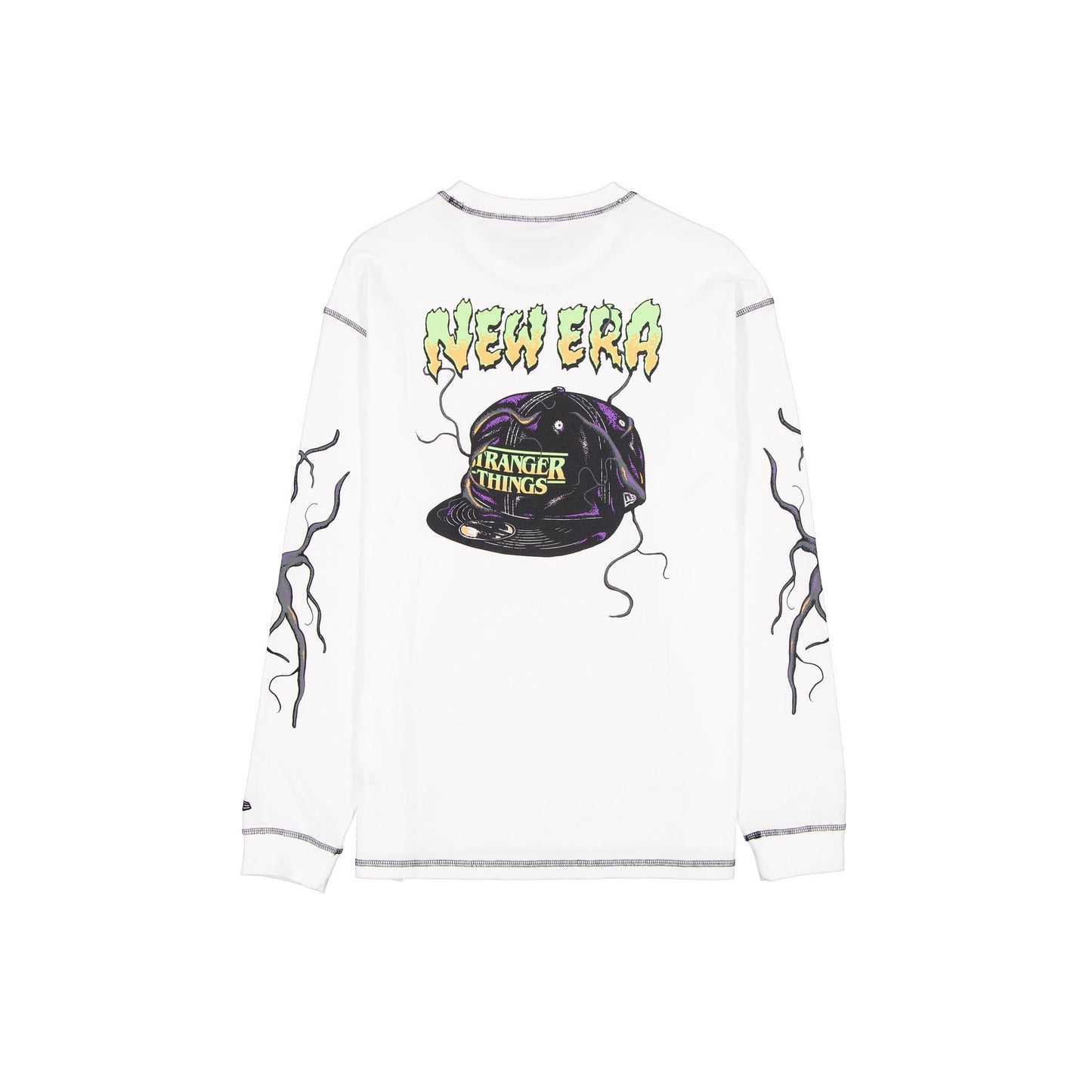 Stranger Things White Long-Sleeve T-Shirt features a screen-printed Stranger Things New Era logo at the front chest with the Upside Down graphics throughout with a cap graphic at the rear.