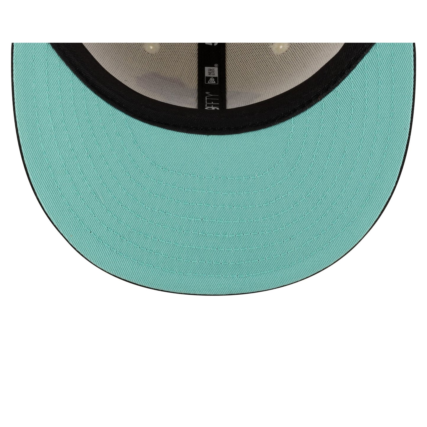 The Sultanes de Monterrey Two-Tone Rose 59FIFTY Fitted Cap features an embroidered Sultanes logo and roses at the front panels with a matching team wordmark at the right-wear side. Additional details include an alternate team wordmark at the rear with a black visor and a mint undervisor.