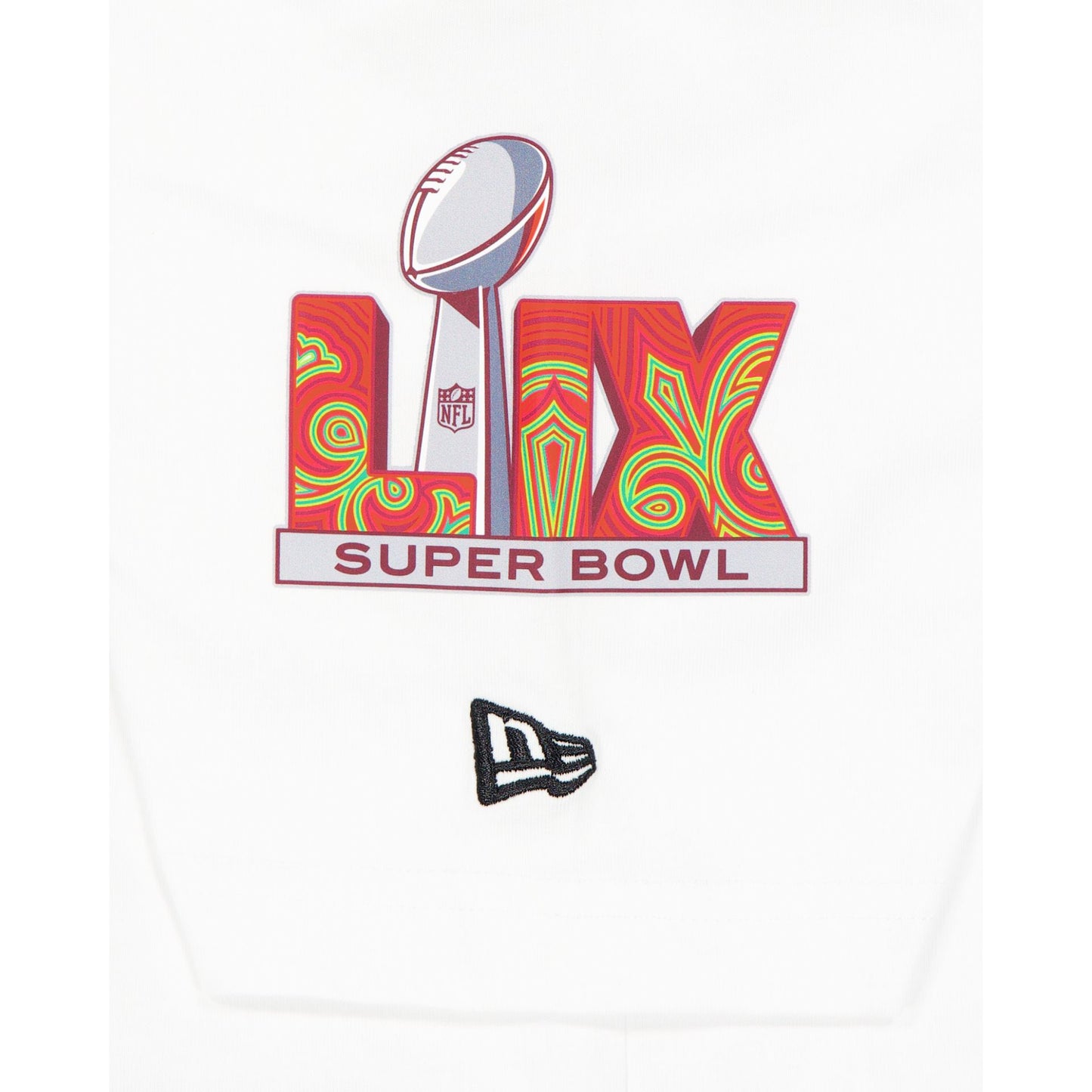The Super Bowl LIX White T-Shirt features a screen-printed Super Bowl LIX graphic at the front and a logo at the left sleeve.