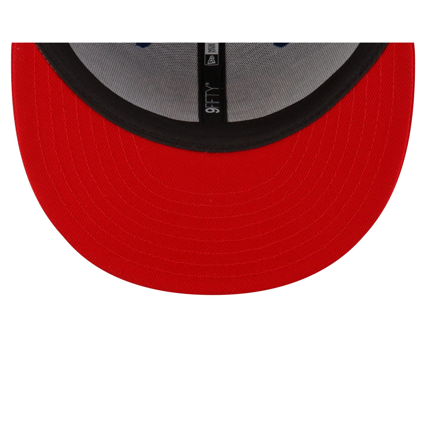 The Superman 9FIFTY Snapback features an embroidered Superman logo at the front panels with the DC logo above a snapback closure at the rear and a red undervisor.