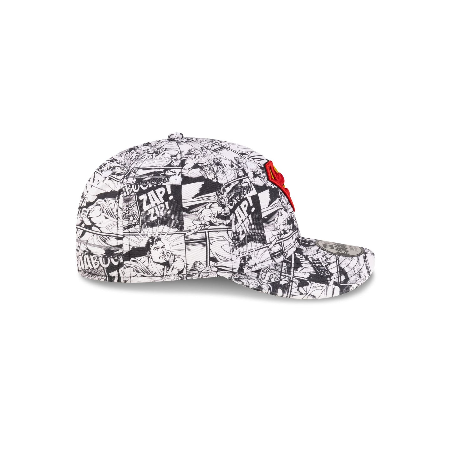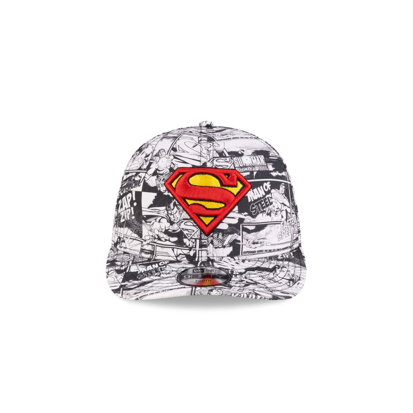 The Superman Comic Book Kids 9FIFTY Snapback features an embroidered Superman logo at the front panels with a comic book allover print fabrication, an adjustable snapback closure at the rear, and a red undervisor.