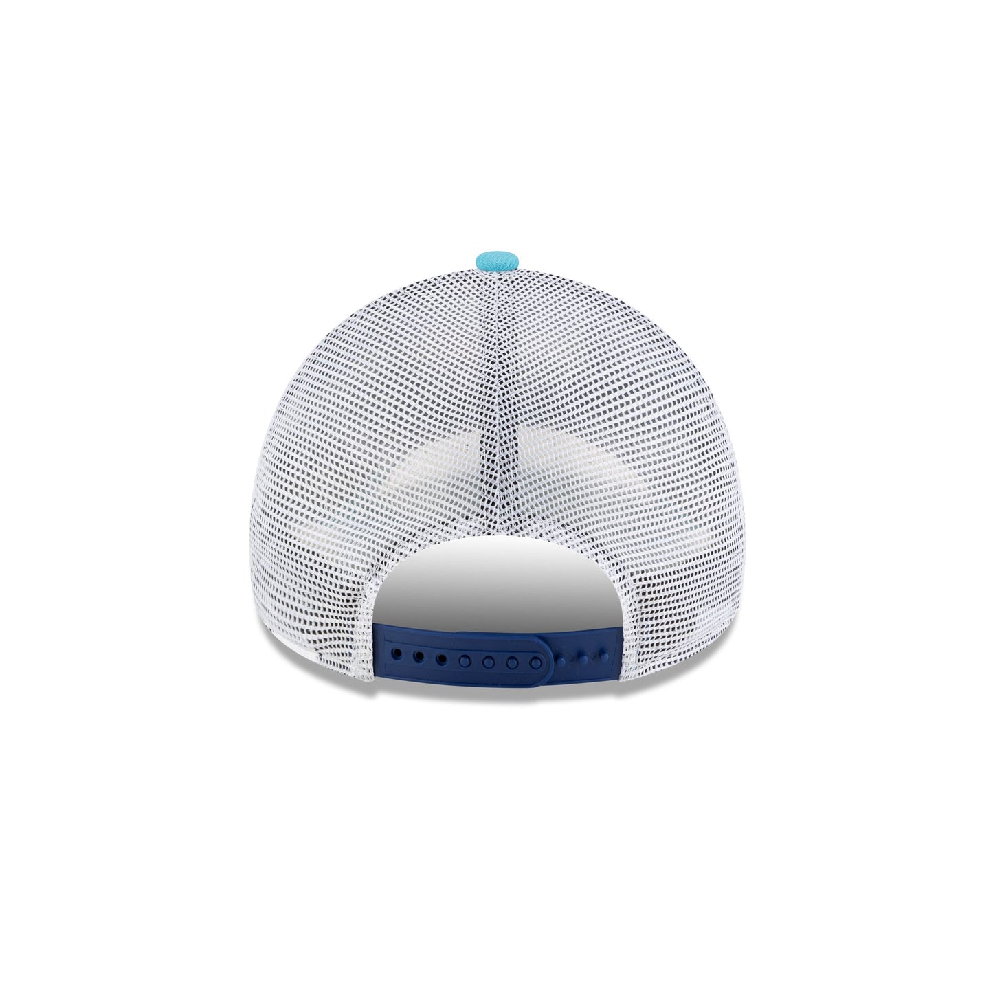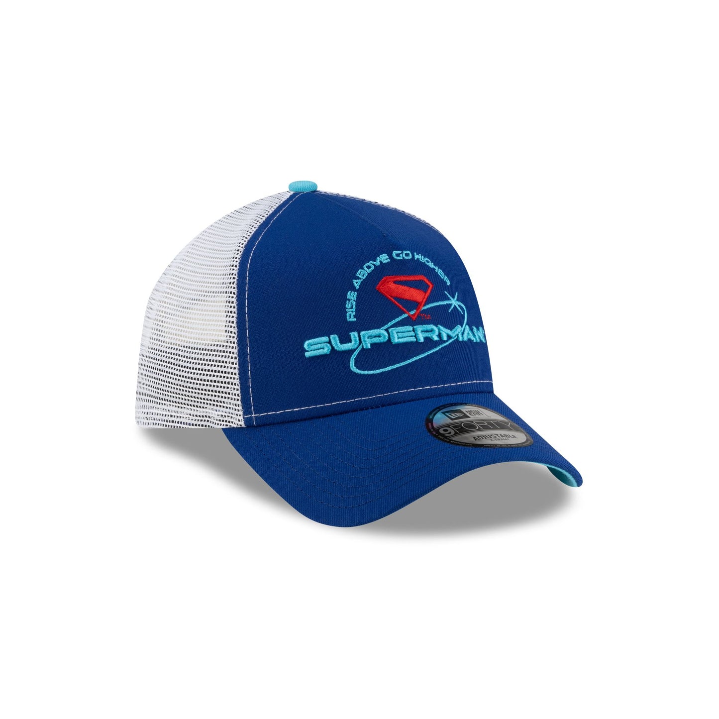 The Superman Rise Above Go Higher 9FORTY A-Frame Trucker features an embroidered Superman logo above a matching wordmark with a Rise Above Go Higher script at the front. Additional details include a snapback closure at the rear and a blue undervisor.