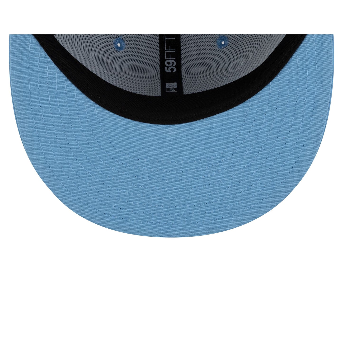 The Superman Sky Blue Mesh 59FIFTY Fitted Cap features a silicone Superman logo at the front with an embroidered wordmark at the rear and a blue undervisor.