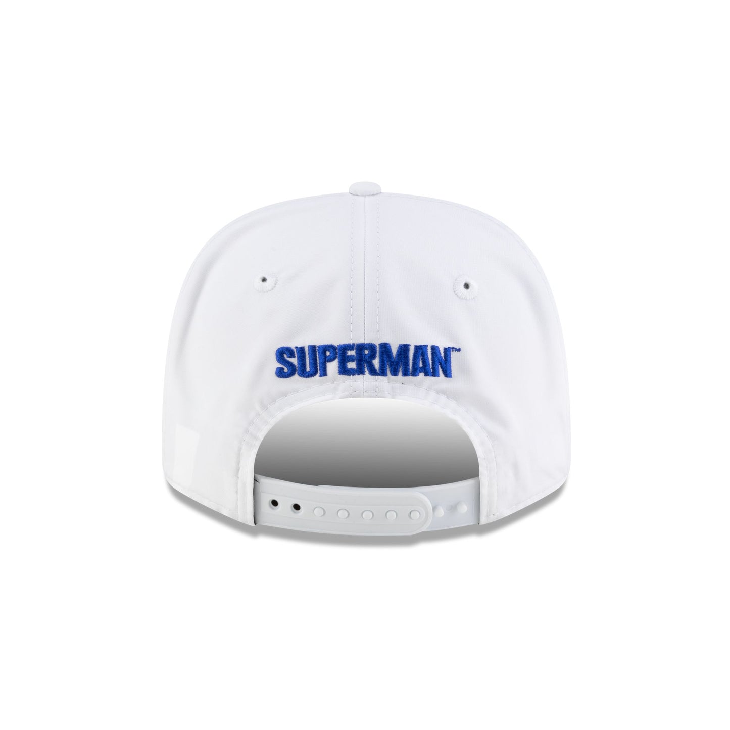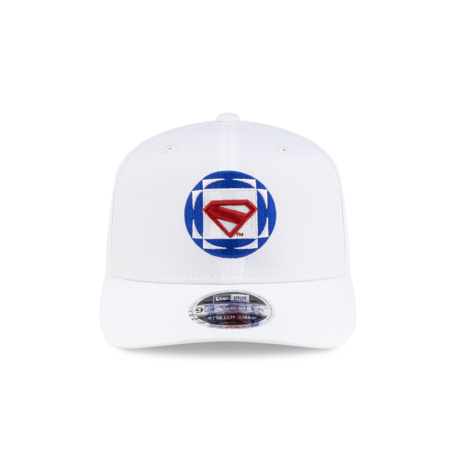 The Superman White 9SEVENTY Stretch-Snap features an embroidered Superman logo at the front panels with a matching wordmark above a snapback closure at the rear and a white undervisor.