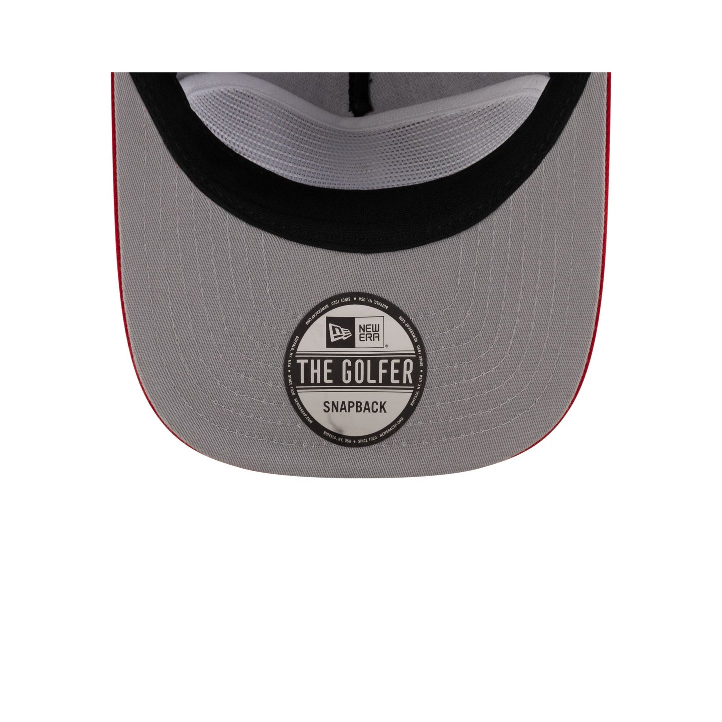 The Tampa Bay Buccaneers 2025 Draft Golfer features an embroidered Buccaneers logo and wordmark at the front panels with an NFL Shield logo above a snapback closure at the rear. Additional details include ornamental stitched details at the visor and a gray undervisor.