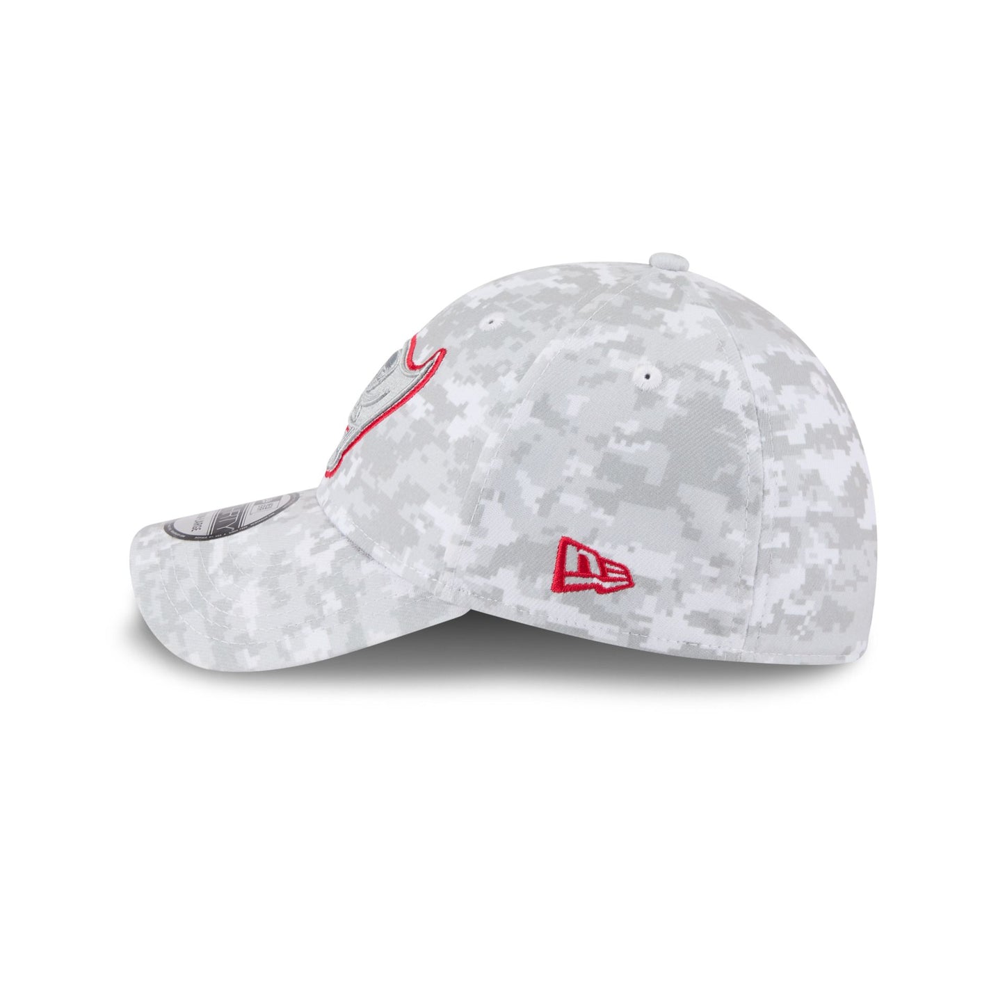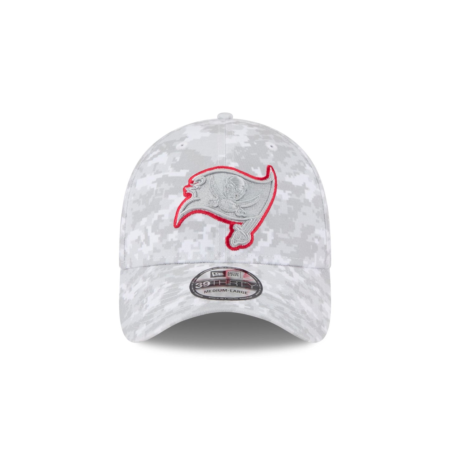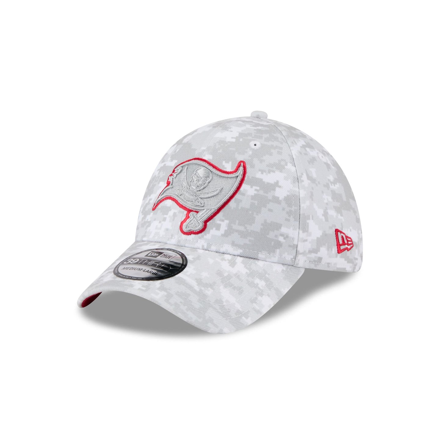The Tampa Bay Buccaneers 2025 Salute to Service Fan Gear 39THIRTY Stretch Fit Cap features an embroidered Buccaneers logo at the front panels with the official NFL Salute to Service patch at the rear, an American flag patch at the right-wear side, and a team color undervisor.