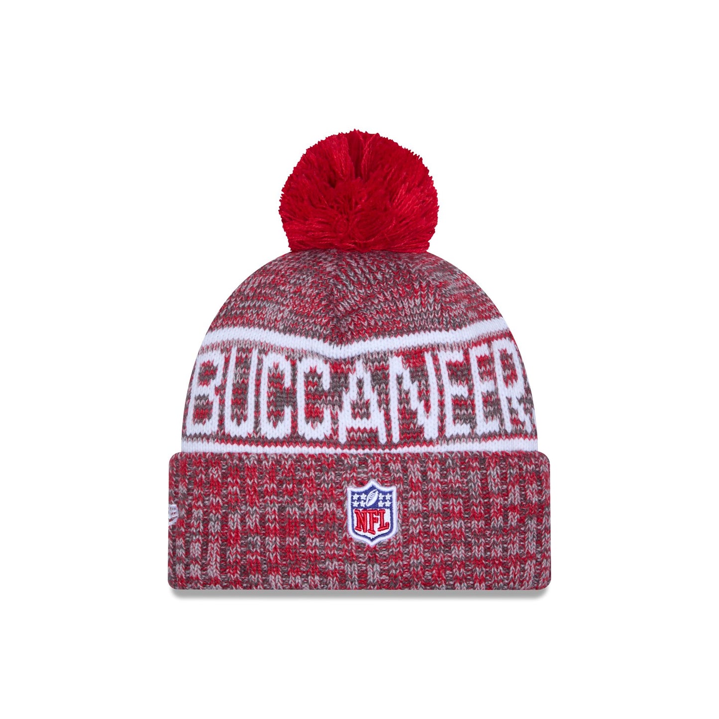 The Tampa Bay Buccaneers 2025 Sideline Cold Weather Pom Knit Hat features a sewn-down silicone Buccaneers logo patch at the front cuff with a matching Official NFL Shield logo at the rear. Additional details include a team wordmark across the crown, a one-time removeable pom, and a fleece lining.
