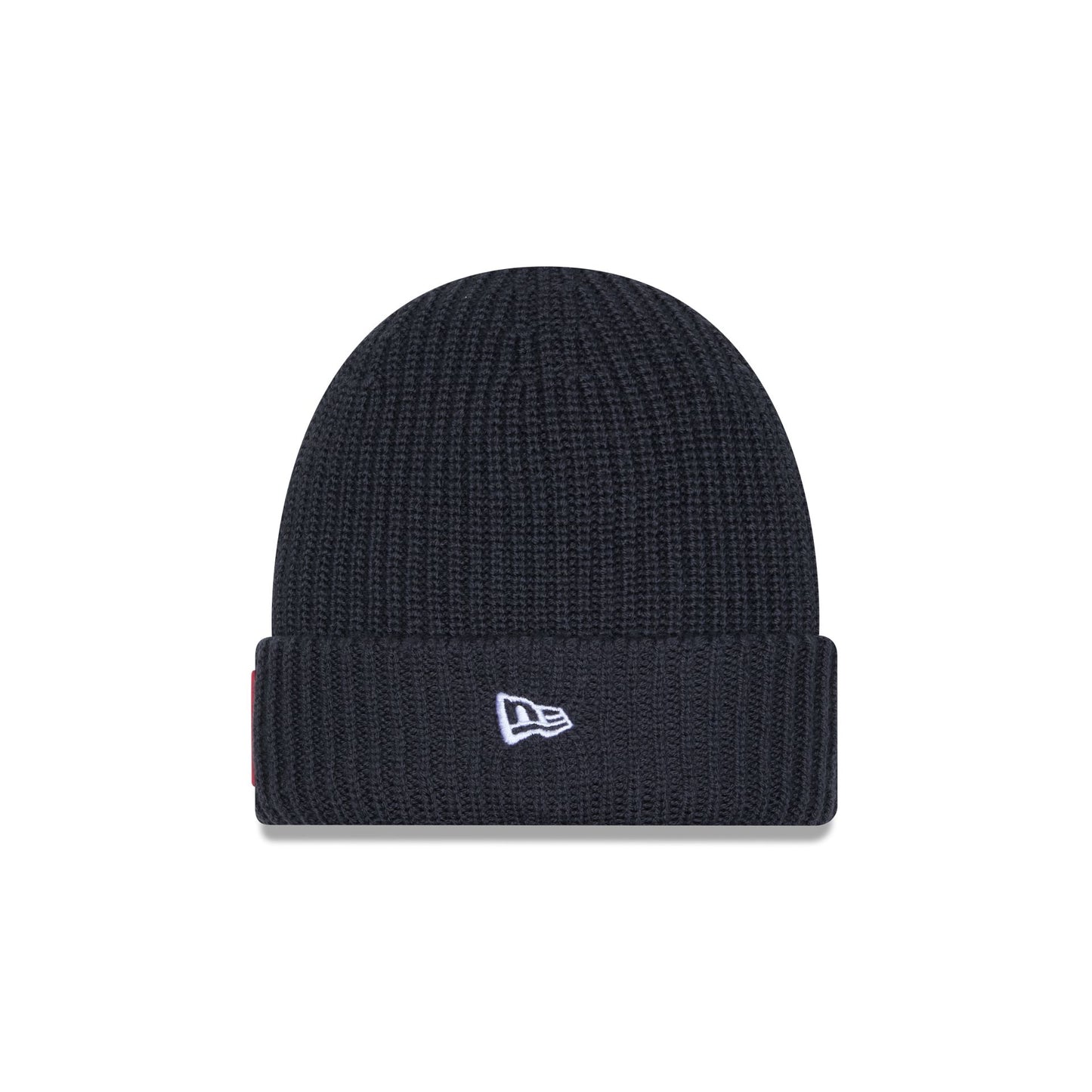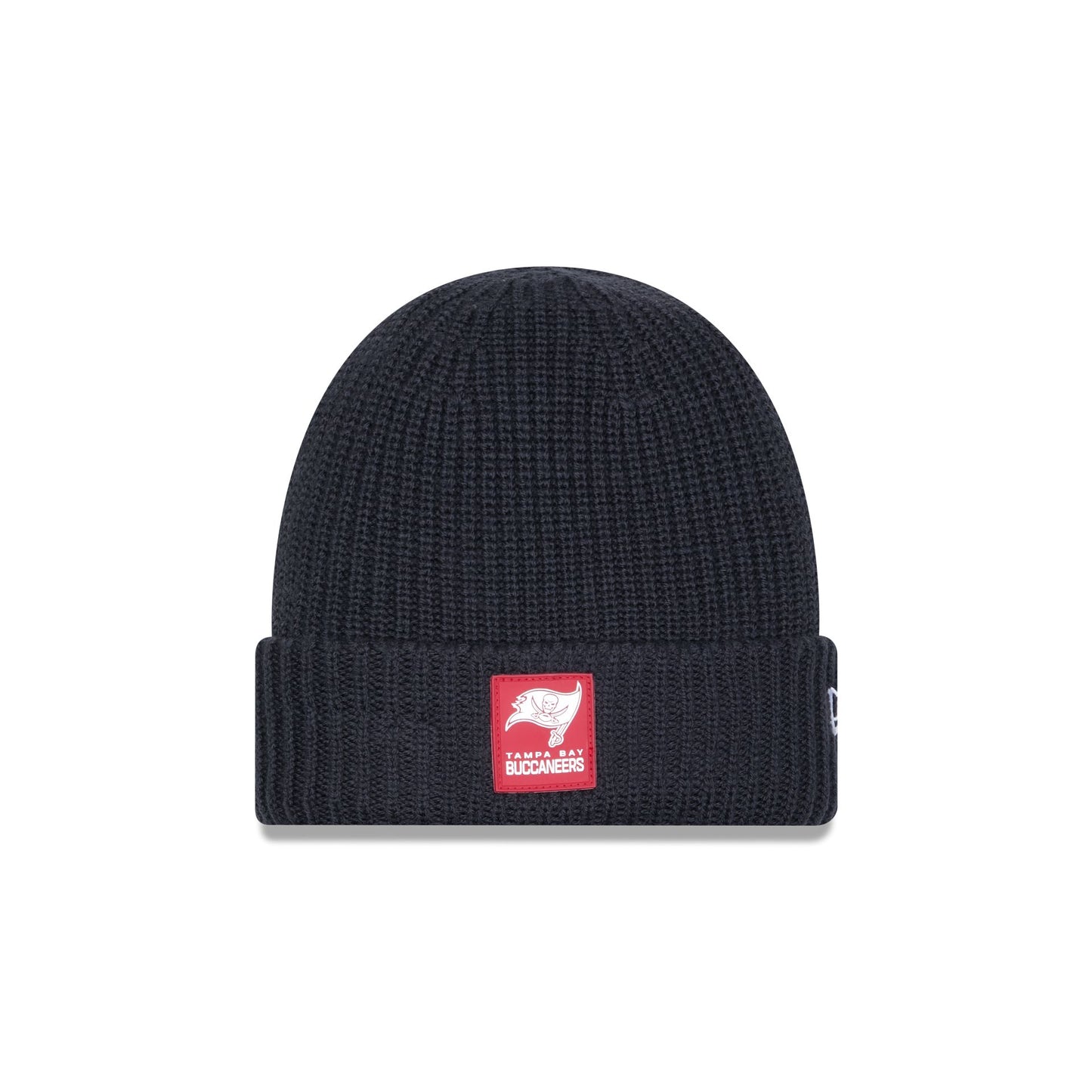 The Tampa Bay Buccaneers 2025 Sideline Cold Weather Steel Clouds Cuff Knit Beanie features a sewn-down silicone Buccaneers logo patch at the front cuff with a matching Official NFL Shield logo at the rear. The beanie is knit from wool yarn and lined with fleece.