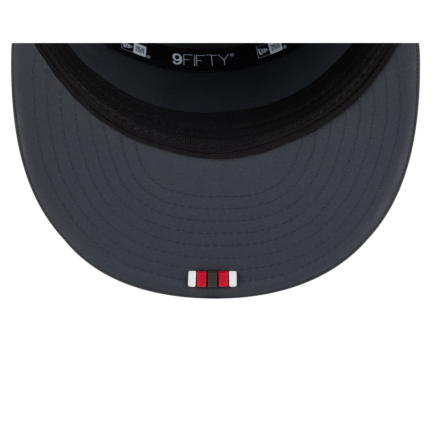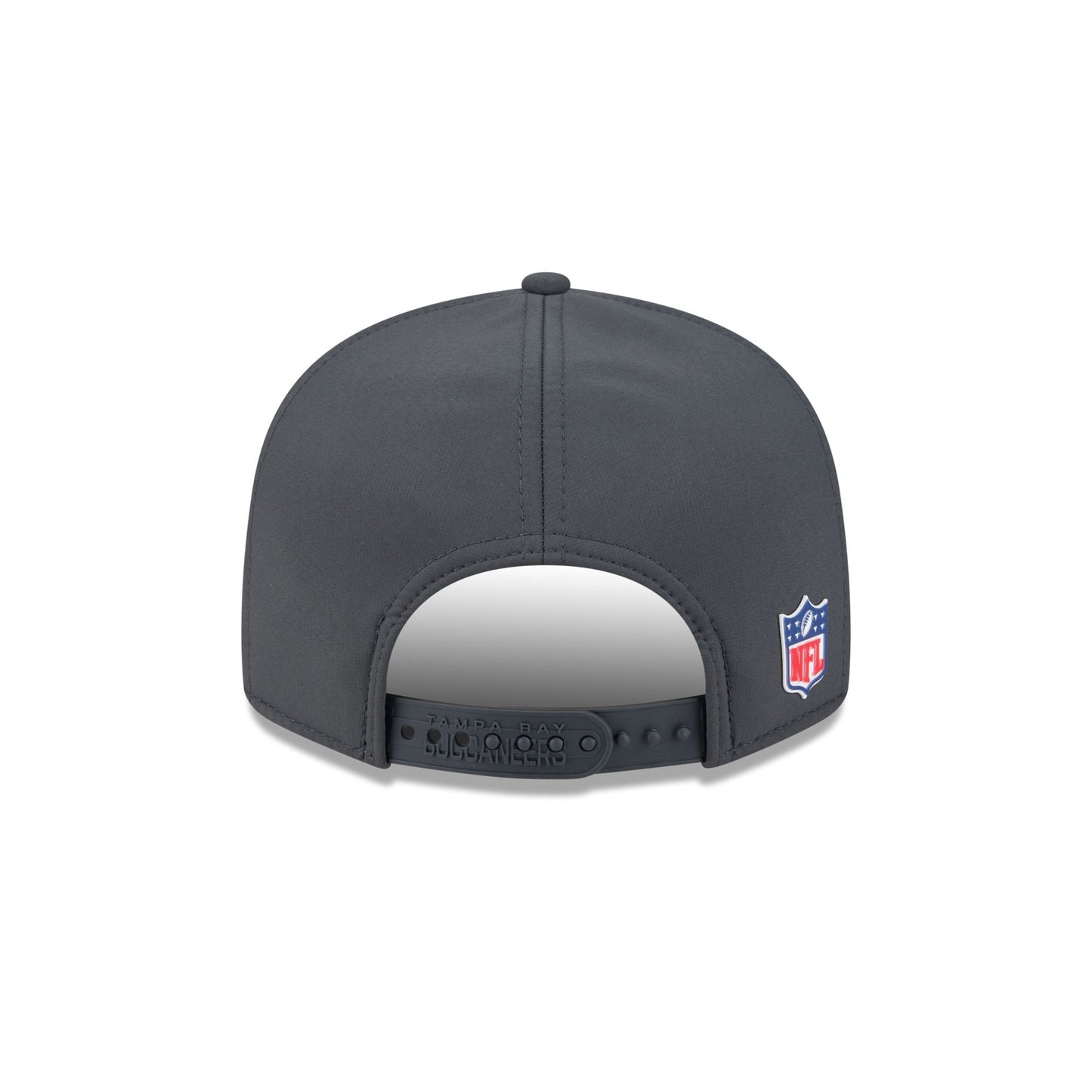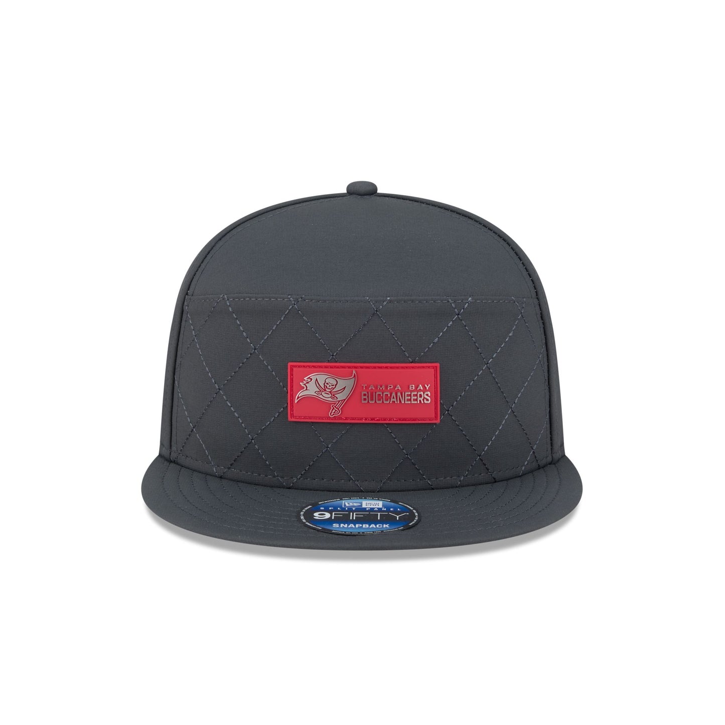 The Tampa Bay Buccaneers 2025 Sideline Cold Weather Steel Clouds Split Panel 9FIFTY Snapback features a sewn-down silicone Buccaneers logo patch at the front panels with a split-crown construction and diamond quilting. The cap has a water-repellent quill tech fabrication throughout, with a quick-dry cushioned sweatband to absorb moisture. Additional details include the Official NFL Shield logo to the right of a soft silicone snapback closure at the rear with eyelets at each side panel. The undervisor is accented with a silicone transfer in the team’s colors.