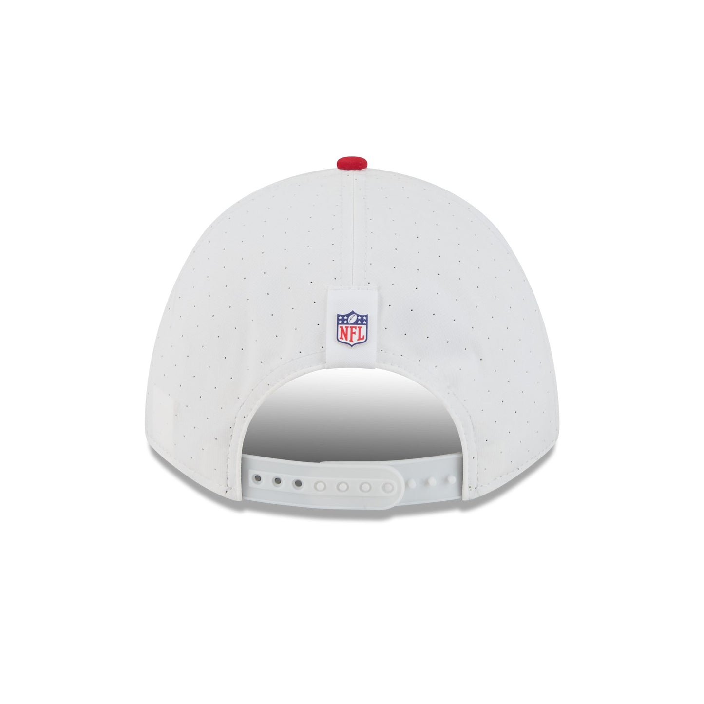 The Tampa Bay Buccaneers 2025 Training 9FORTY M-Crown A-Frame Snapback features a silicone Buccaneers patch at the front panel with team color stripes at the front of a red visor. Additional details include a silicone NFL Shield patch on a woven foldover tab above a snapback closure at the rear.