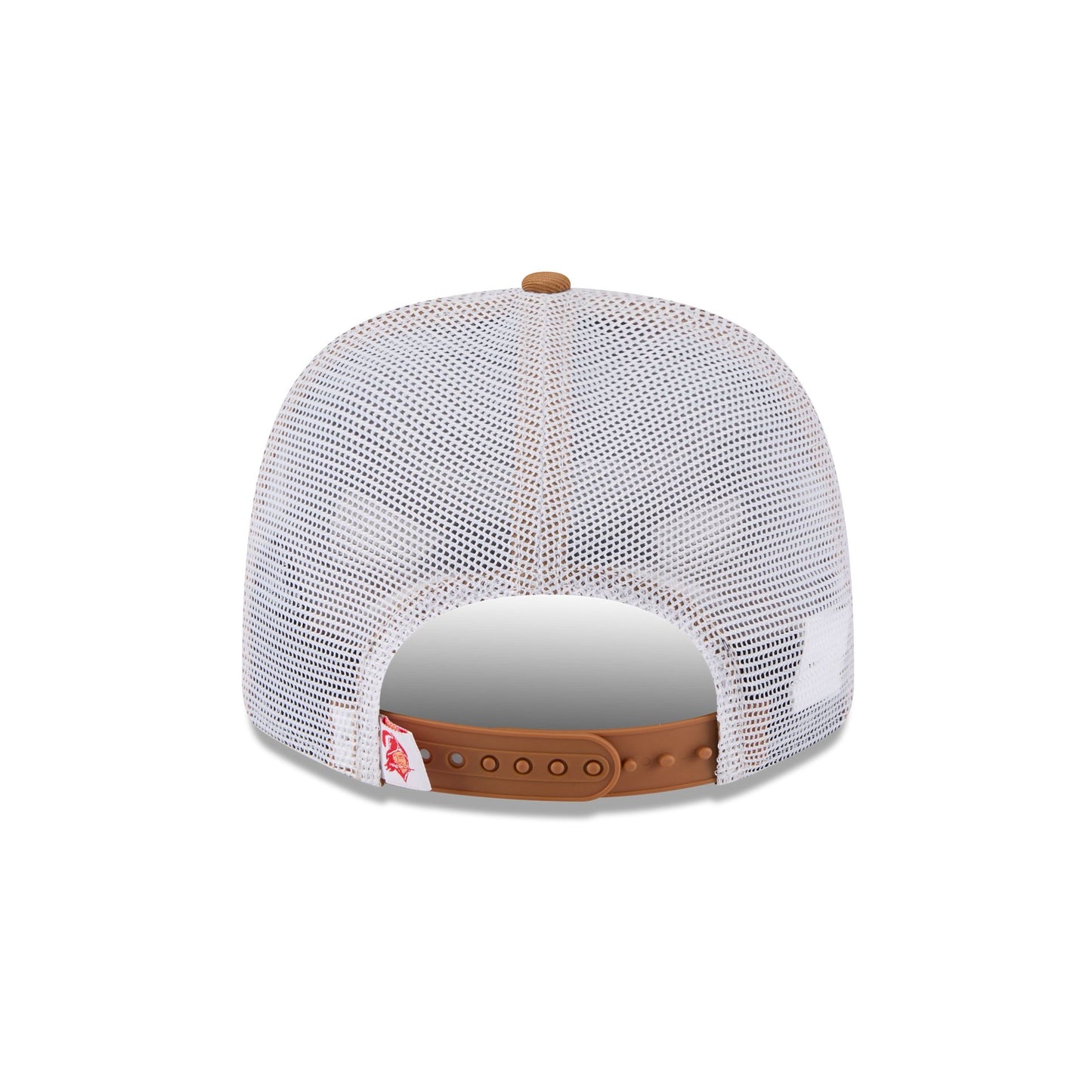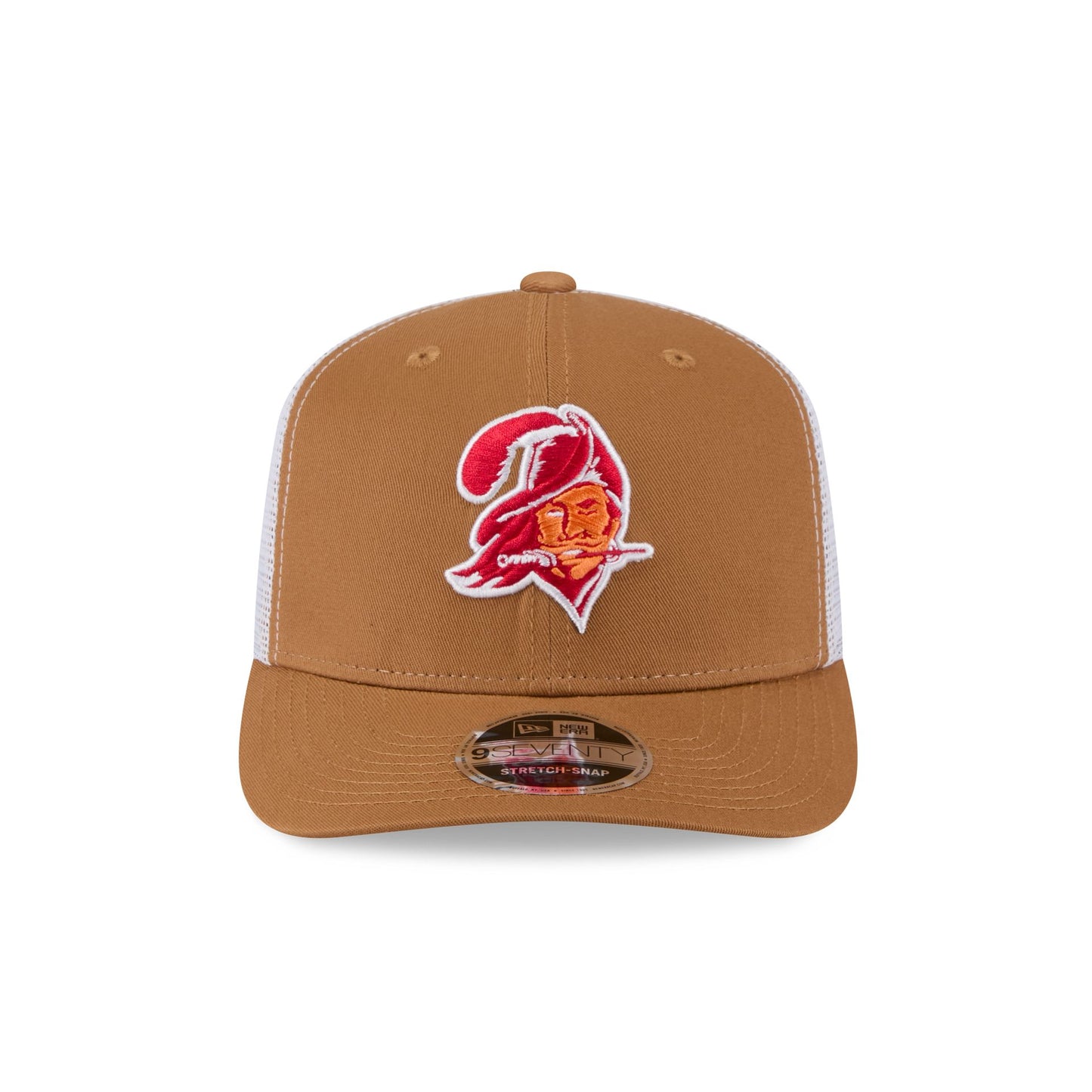 The Tampa Bay Buccaneers Bronze 9SEVENTY Trucker features an embroidered Buccaneers Historic logo at the front panels with a matching woven team tag at a snapback closure at the rear.