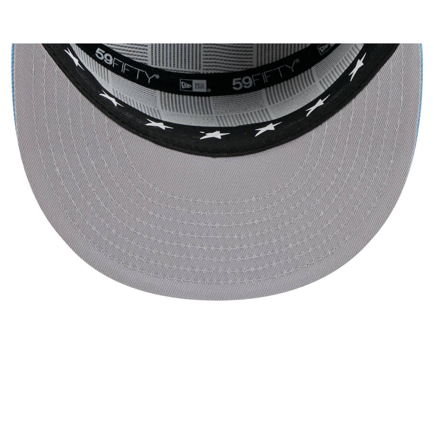The Tampa Bay Rays 2025 All-Star Game Split Panel 59FIFTY Fitted Cap features an embroidered Rays logo at the front panels against a split-crown construction with breathable mesh fabric at the side and rear panels. Additional details include stars at the top panel, a 2025 All-Star Game patch at the right-wear side, the MLB Batterman logo at the rear, and a gray undervisor. The cap also features screen-printed stars on the sweatband.