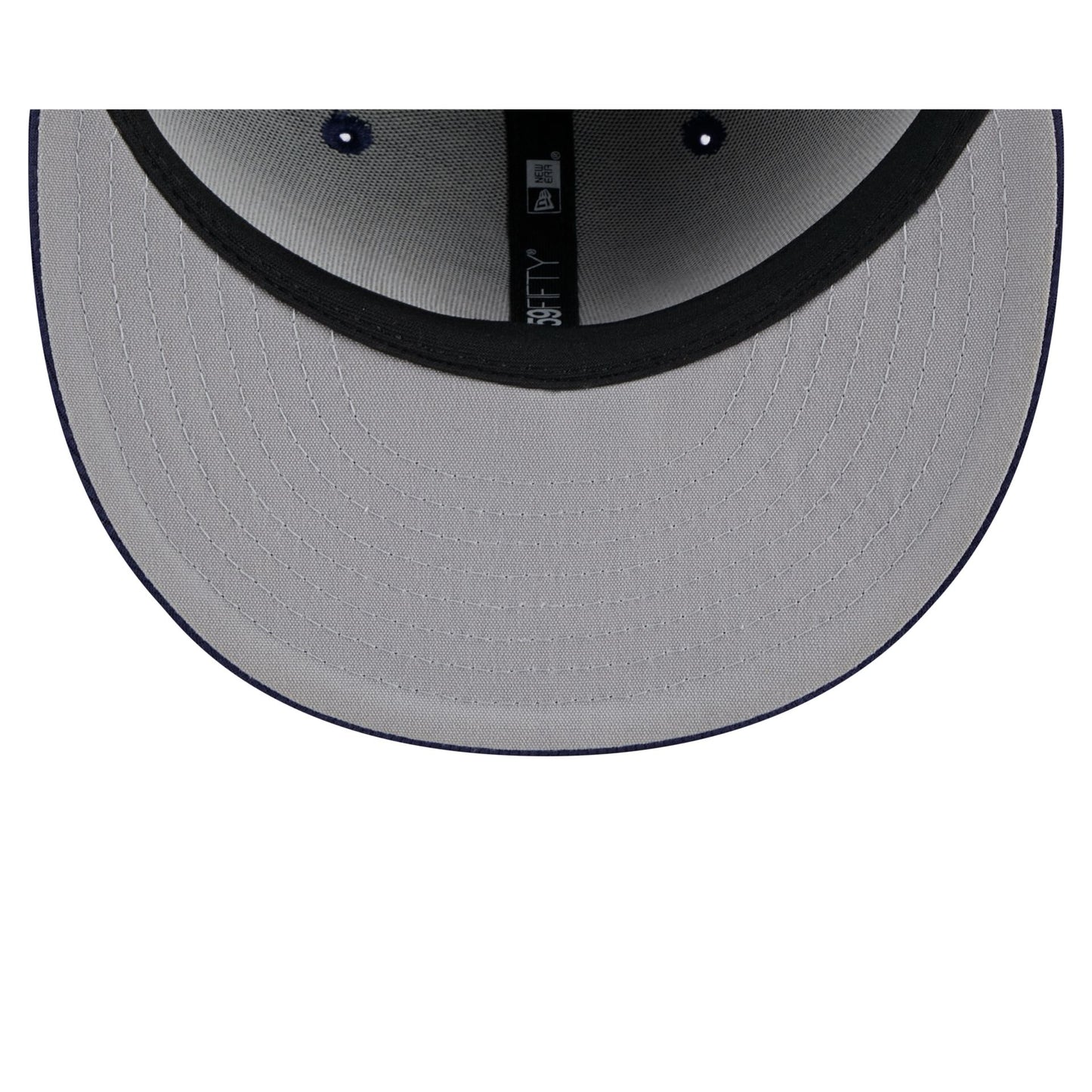 The Tampa Bay Rays 2025 Batting Practice 59FIFTY Fitted Cap features an embroidered Rays logo at the front panels with a matching MLB Batterman logo at the rear. Additional details include a pivot knit fabrication, a blue visor, and a gray undervisor.