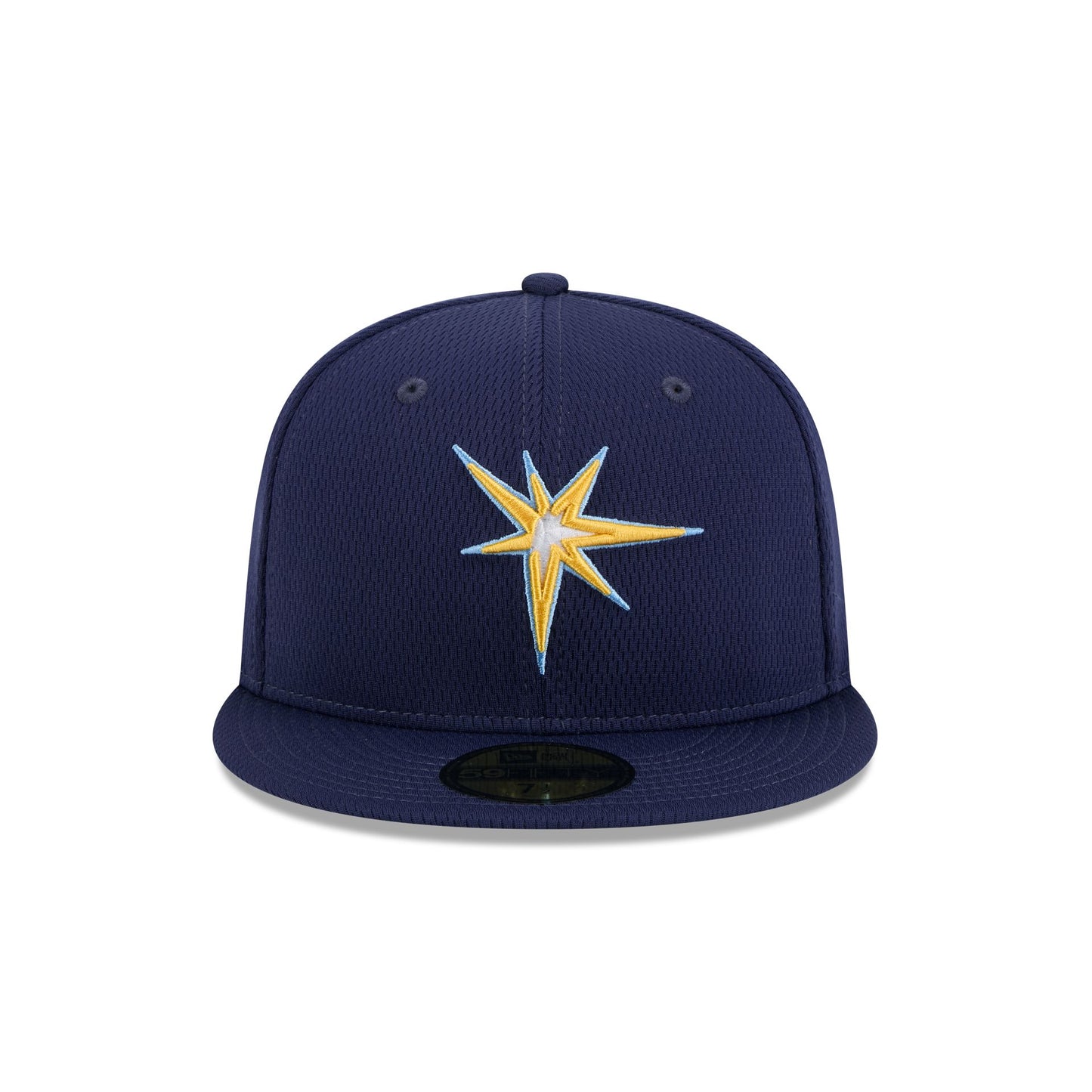 The Tampa Bay Rays 2025 Clubhouse Alt 59FIFTY Fitted Cap features an embroidered Rays alternate logo at the front panels with a matching MLB Batterman logo at the rear. Additional details include a dashmark mesh fabrication and a silicone logo on a gray undervisor.