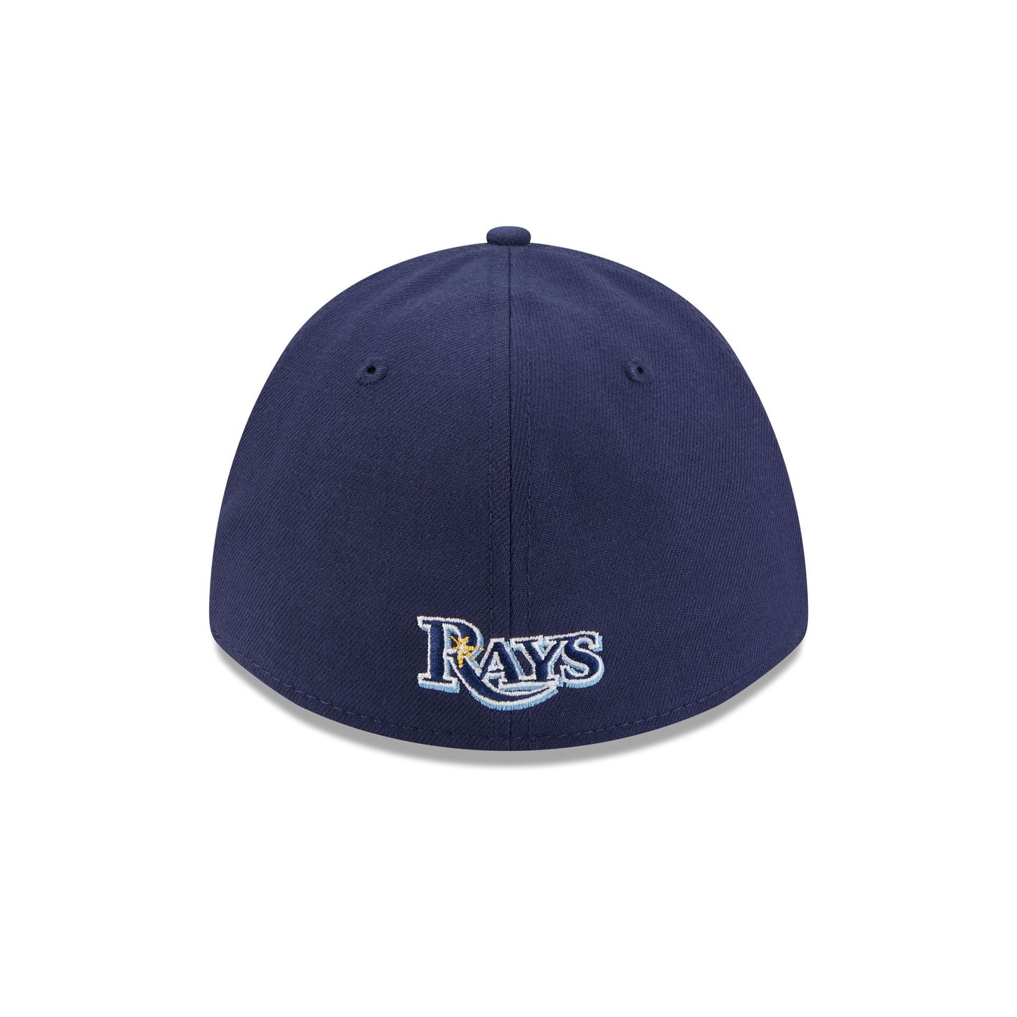 The Tampa Bay Rays 39THIRTY M-Crown A-Frame Stretch Fit Cap features an embroidered Rays logo at the front panel with a matching team wordmark at the rear and a gray undervisor. Additional details include a Performance Stretch sweatband and a New Era Flag at the left-wear side.