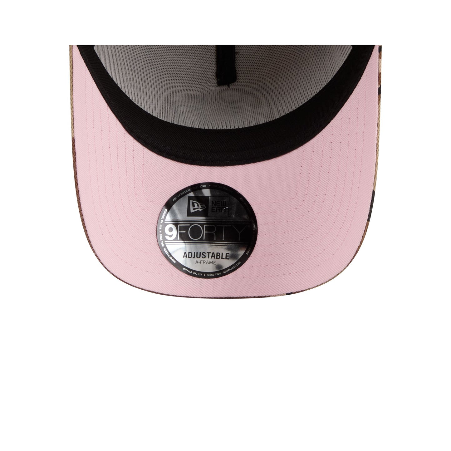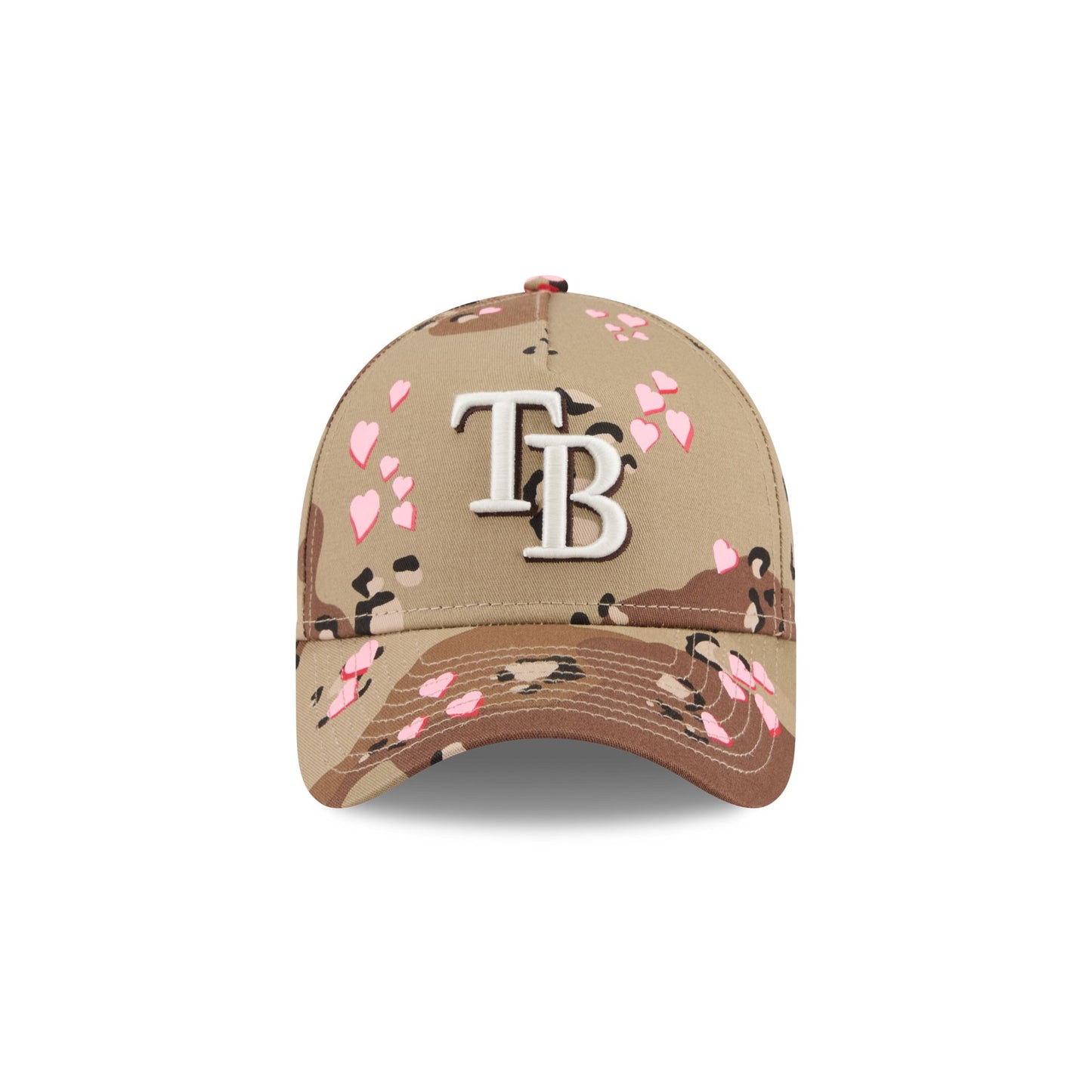 The Tampa Bay Rays Camo Hearts 9FORTY A-Frame Snapback features an embroidered Rays logo at the front panels against a camo and heart print pattern throughout. Additional details include an adjustable snapback closure at the rear and a pink undervisor.