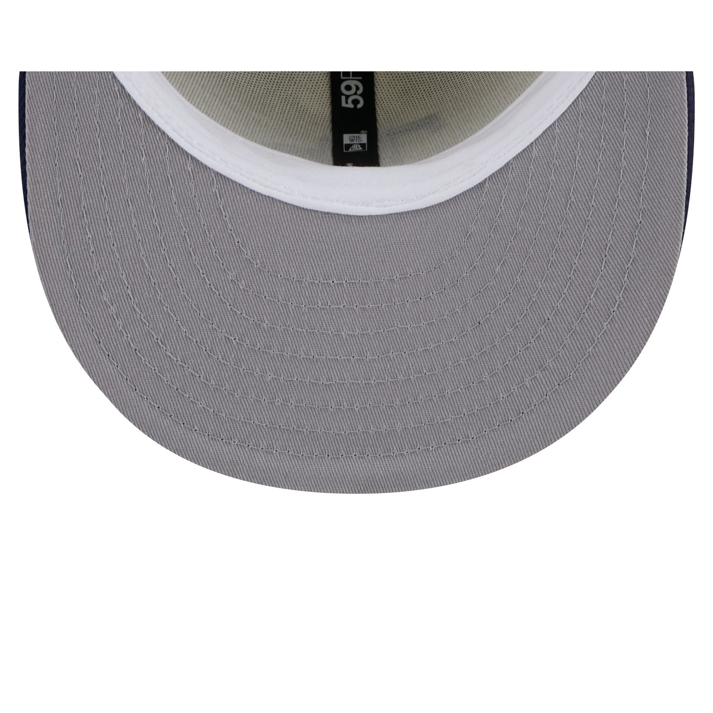 The Tampa Bay Rays Chrome 59FIFTY Fitted Cap features an embroidered Rays logo at the front panels with a matching MLB Batterman logo at the rear, a navy visor, and a gray undervisor.