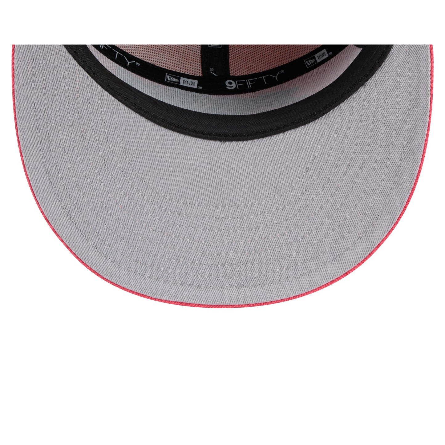 The Tampa Bay Rays Coral 9FIFTY Split Panel Snapback features an embroidered Rays Cooperstown wordmark at the front panels with a snapback closure at the rear, a multicolored crown, and a gray undervisor.