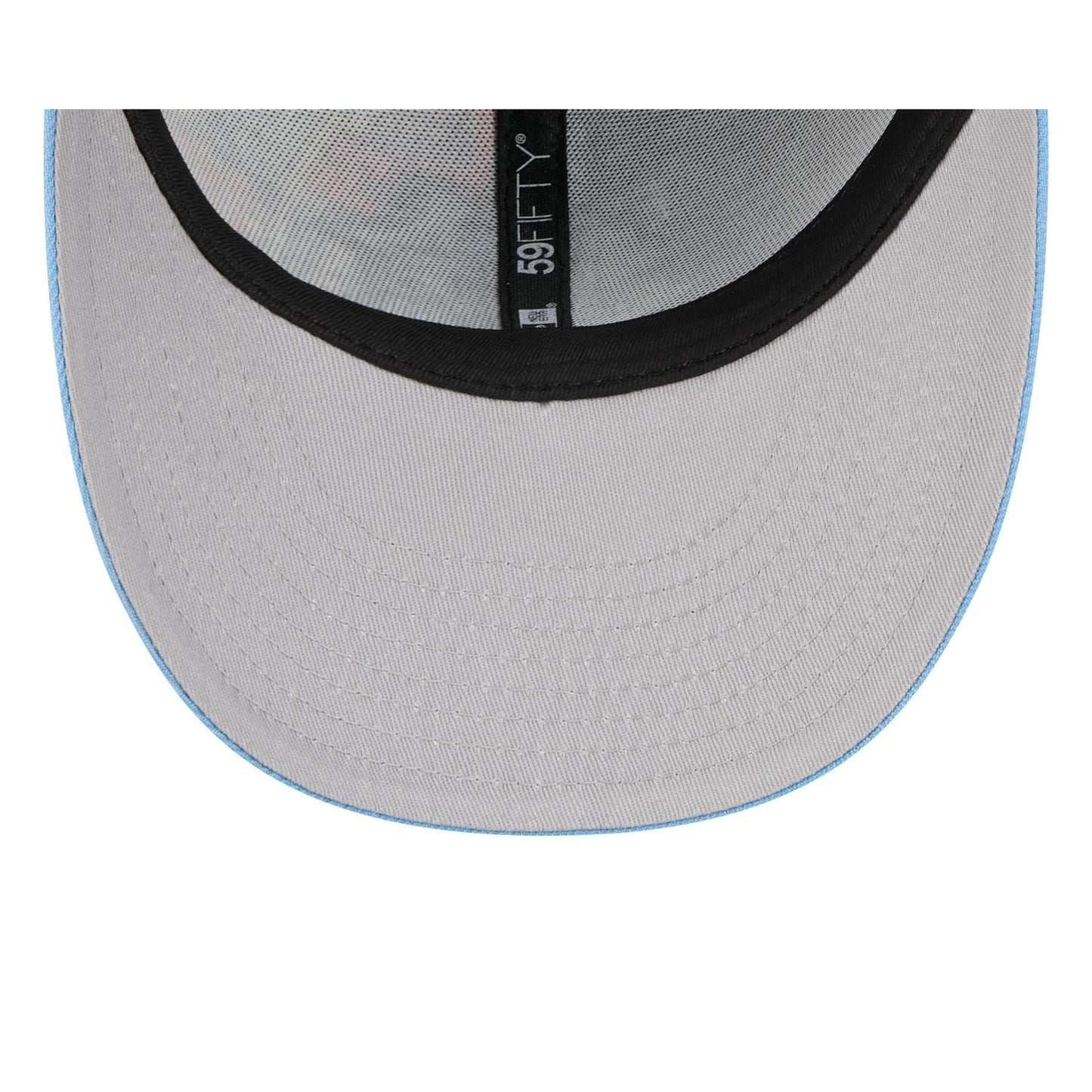 The Tampa Bay Rays Diamond Hero Edition Low Profile 59FIFTY Fitted Cap features an embroidered Rays onomatopoeia pop logo at the front panels with baseball comic book prints at the front and back panel. Additional details include the MLB Batterman logo at the rear and a gray undervisor. This cap comes with a pre-curved visor.