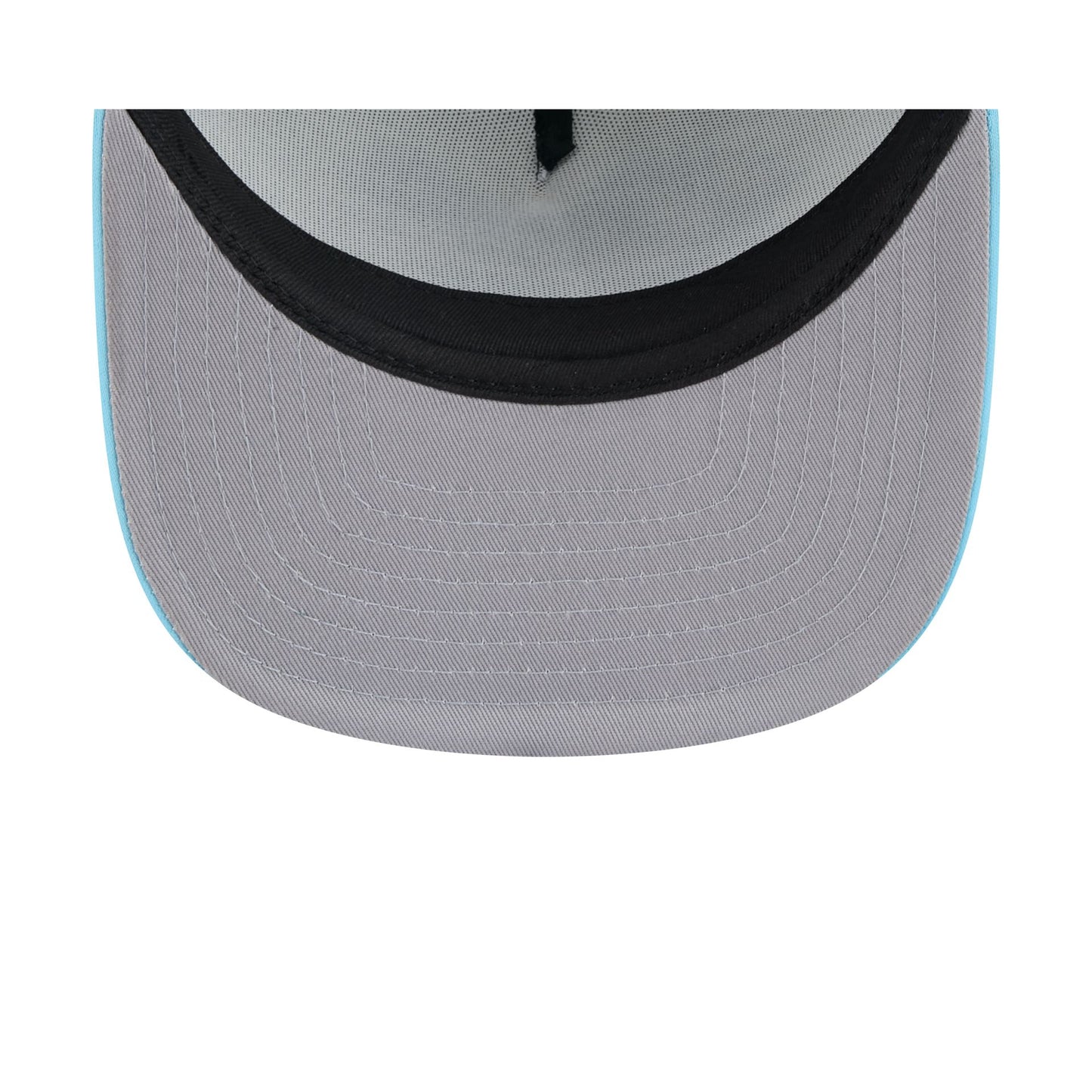 The Tampa Bay Rays Retro Script 9FIFTY A-Frame Trucker features a distressed screen-printed Rays script wordmark and team logo at the front panels with a snapback closure at a mesh rear and a gray undervisor.