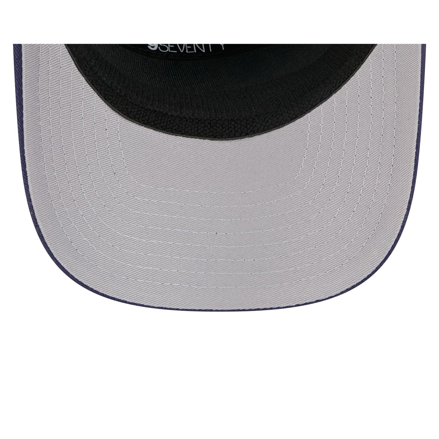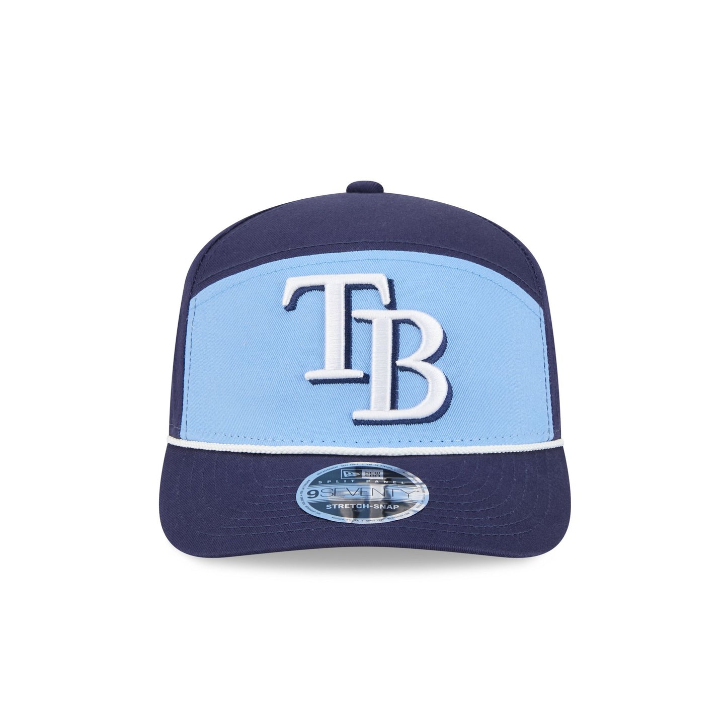 The Tampa Bay Rays Split Panel 9SEVENTY Stretch-Snap features an embroidered Rays logo at the front panel with a split crown construction and a rope at the visor. Additional details include an adjustable stretch-snap closure at the rear and a gray undervisor.