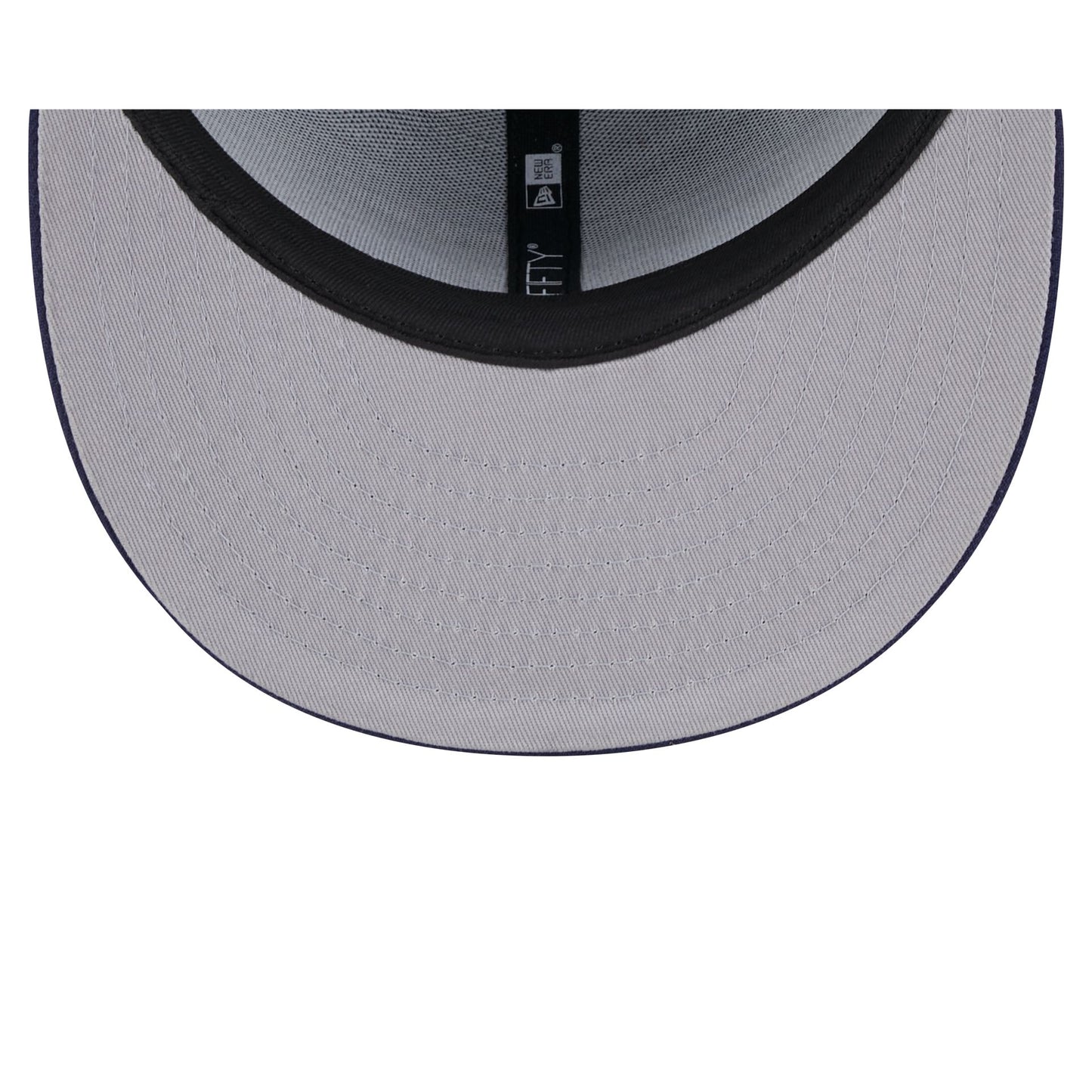 The Tampa Bay Rays Wordmark 9FIFTY Snapback features an embroidered Rays wordmark at the front panels with a matching team logo at the right-wear side, a gray undervisor, and a snapback closure at the rear.