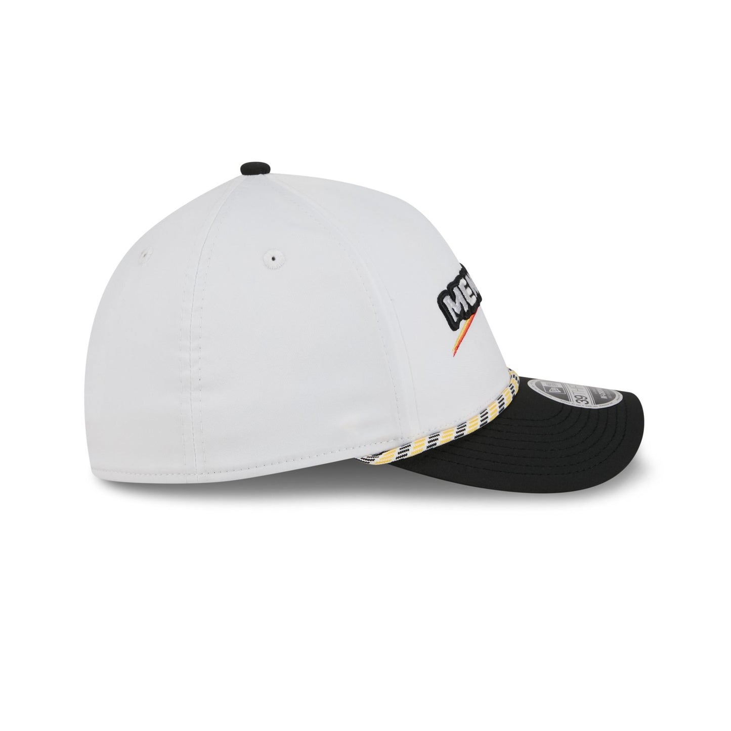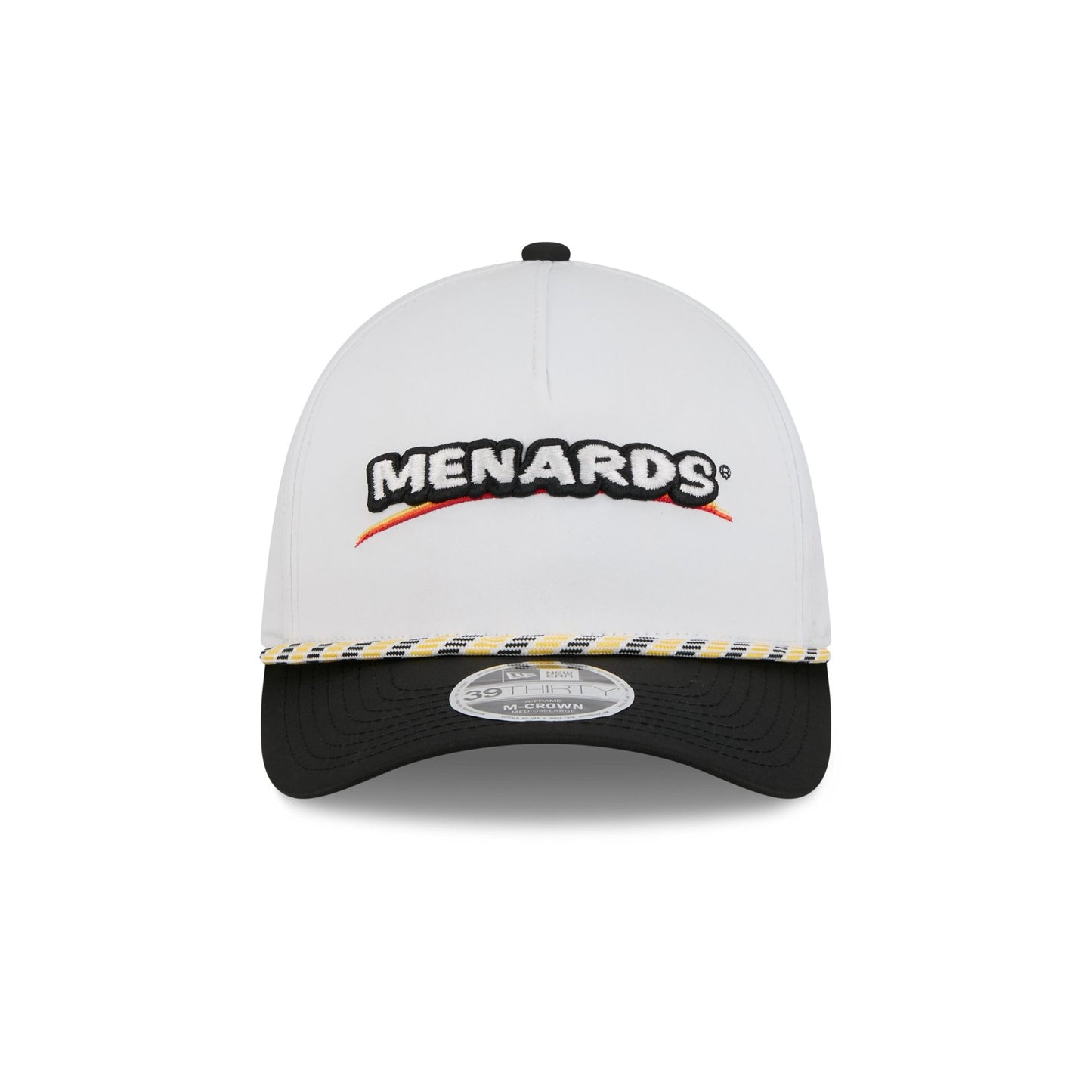The Team Penske Menards Partner Rope 39THIRTY M-Crown A-Frame Stretch Fit features an embroidered Team Penske logo at the front panels with a rope at the visor. Additional details include a wordmark at the rear and a gray undervisor.