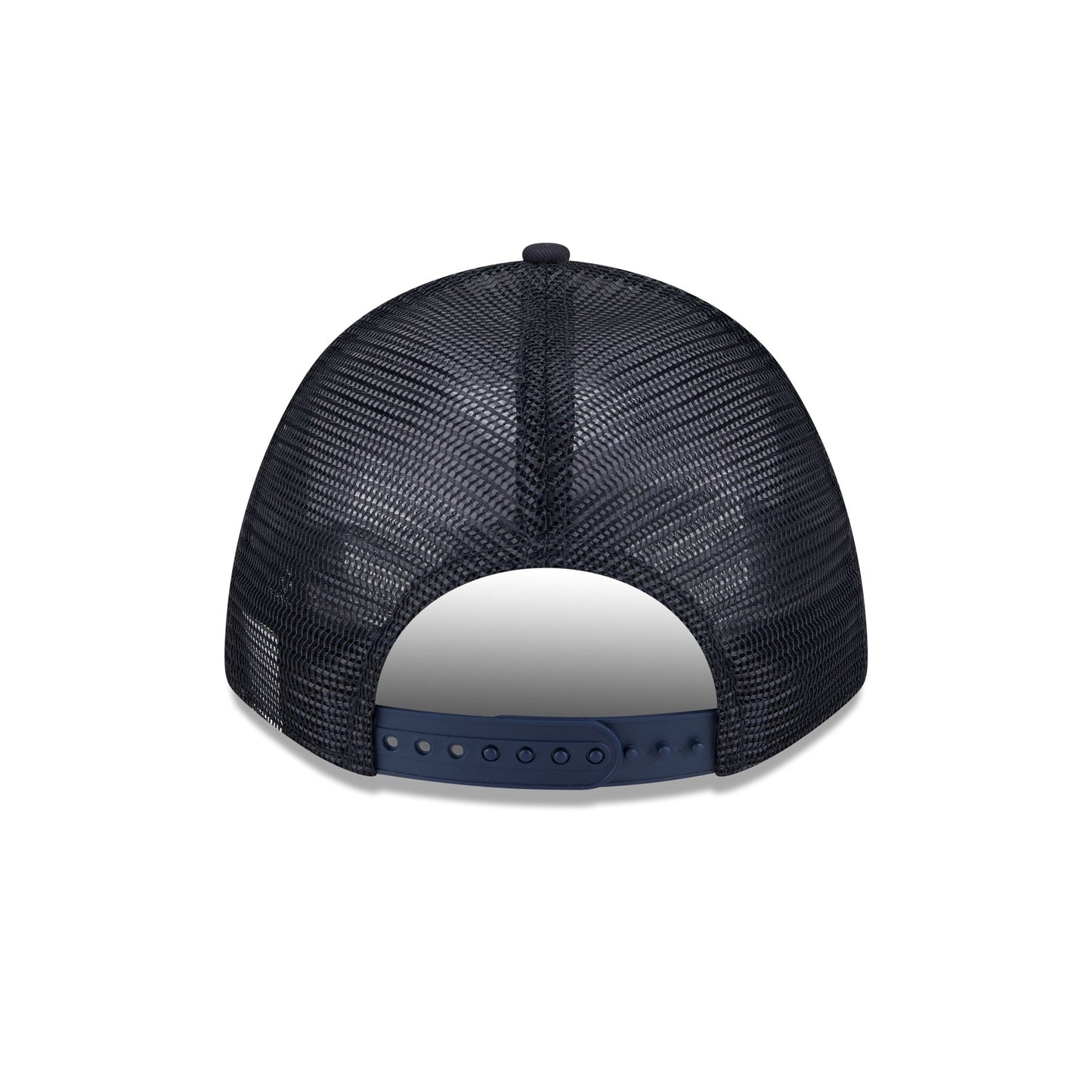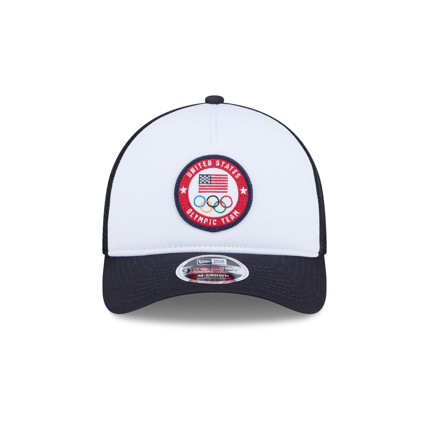 The Team USA 2026 Winter Olympics 9FORTY M-Crown A-Frame Trucker features an embroidered Team USA circle logo at the front panels with an adjustable snapback closure at a mesh rear.
