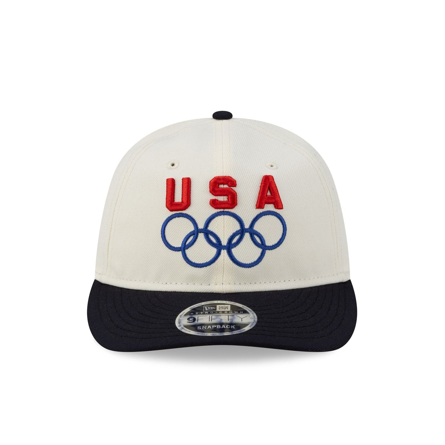 The Team USA Chrome White Navy Retro Crown 9FIFTY Snapback features an embroidered Team USA logo at the front panels with a navy visor and an adjustable snapback closure at the rear.