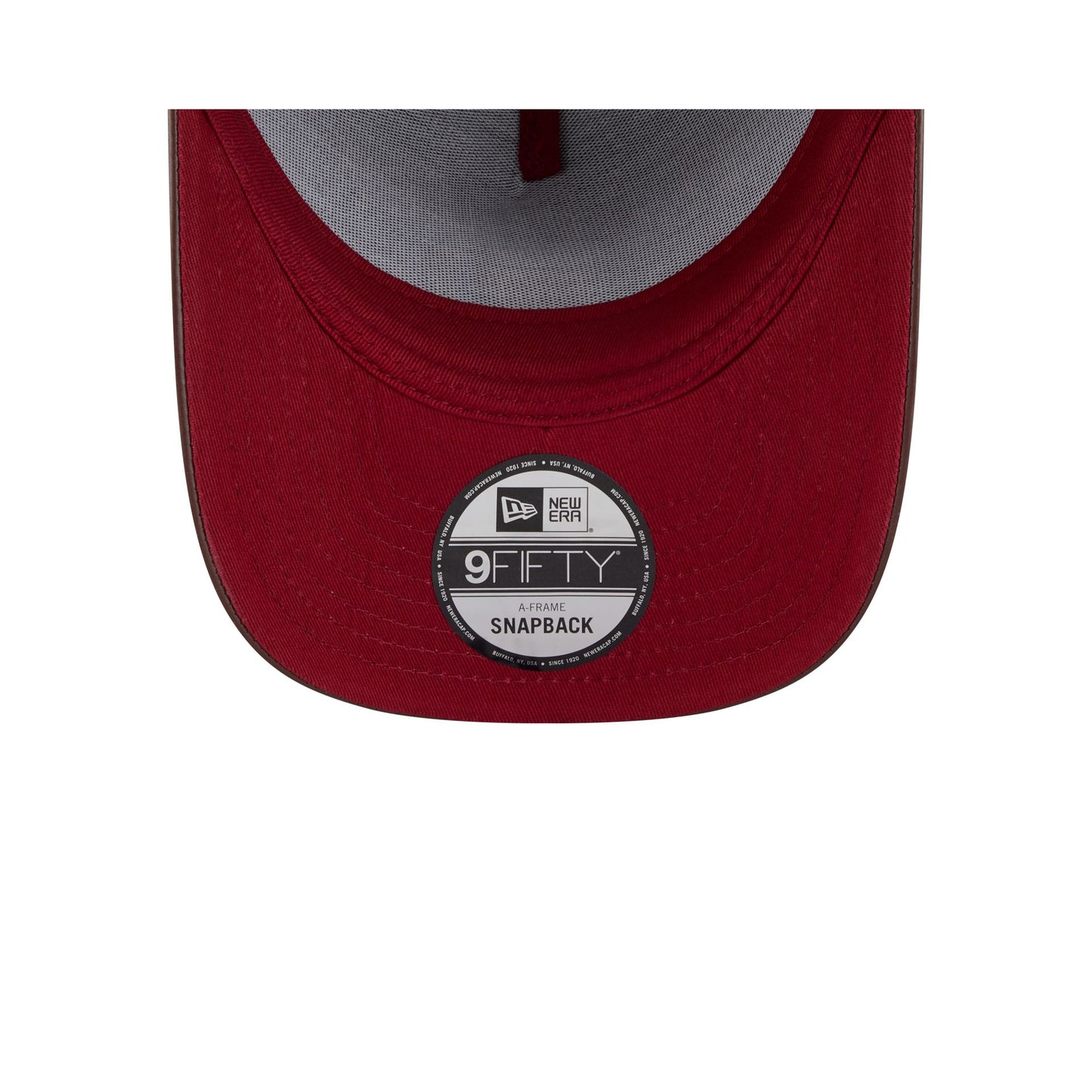 The Team USA Cord Faux Leather 9FIFTY A-Frame Snapback features a felt USA wordmark with an embroidered shield on a faux leather patch at the front panel. Additional details include a team logo above a snapback closure at the rear with a faux leather visor and a red undervisor.