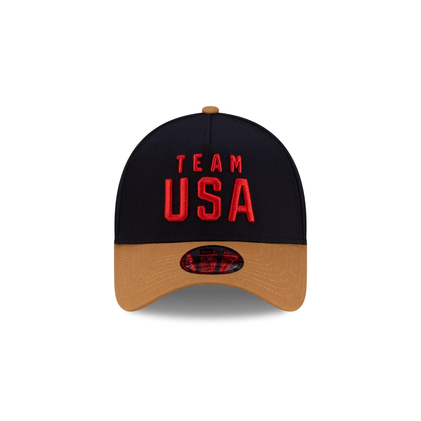 The Team USA Curling 9FORTY A-Frame Snapback features an embroidered USA logo at the front panel with a sport pictogram at the right-wear side. Additional details include an adjustable snapback closure at the rear with a tan visor and a green undervisor.