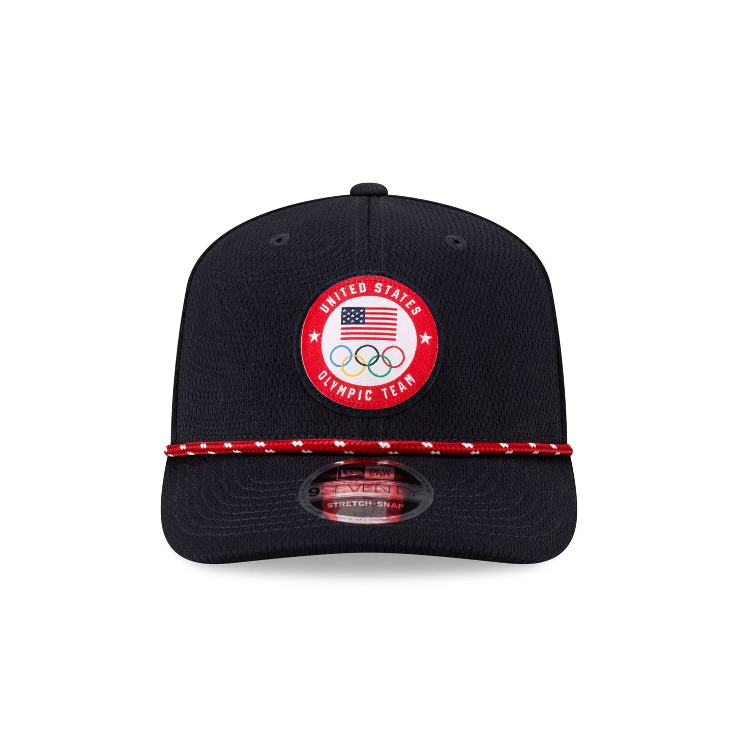 The Team USA Olympics Navy 9SEVENTY Stretch Snap Cap features an embroidered United States Olympic Team logo at the front panels with a matching team shield above a snapback closure at the rear and a gray undervisor.