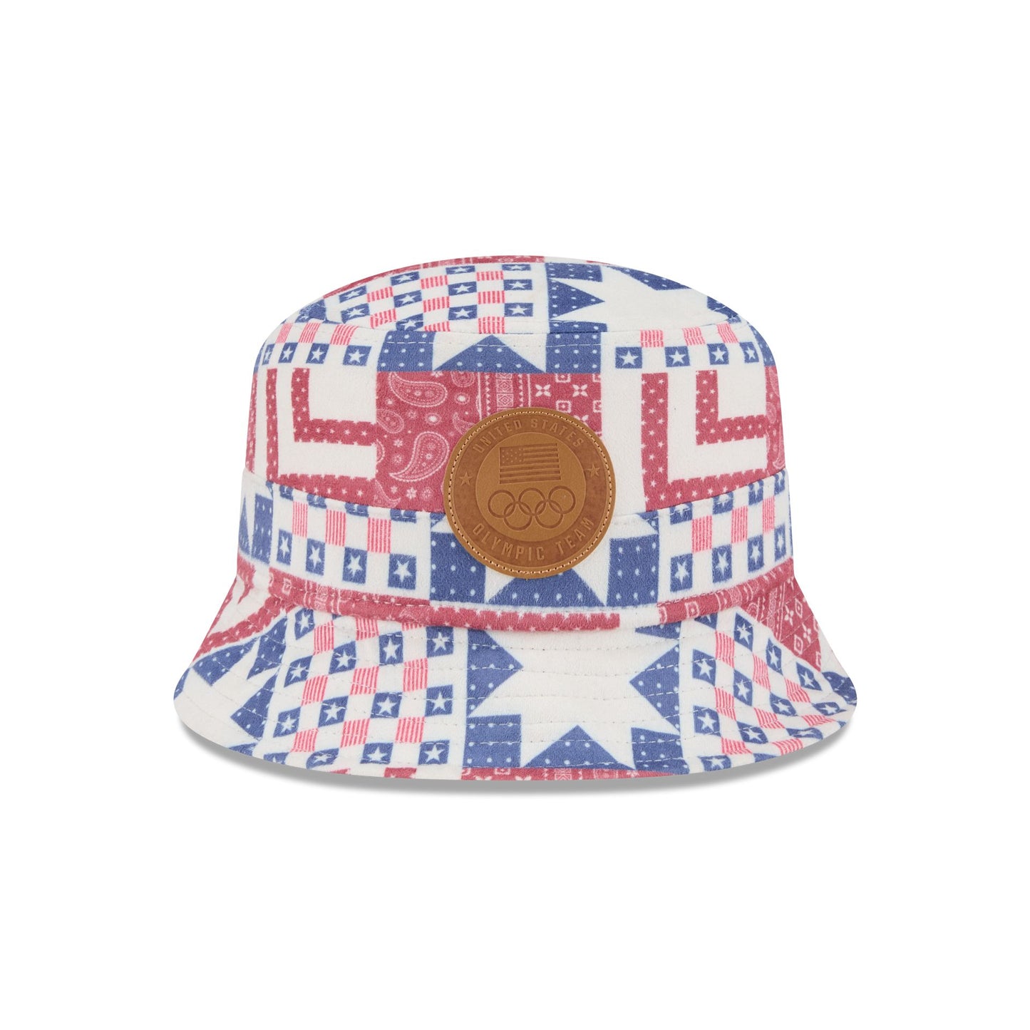The Team USA Paisley Bucket Hat features an embossed faux leather USA patch at the front with a New Era Flag at the left-wear side.