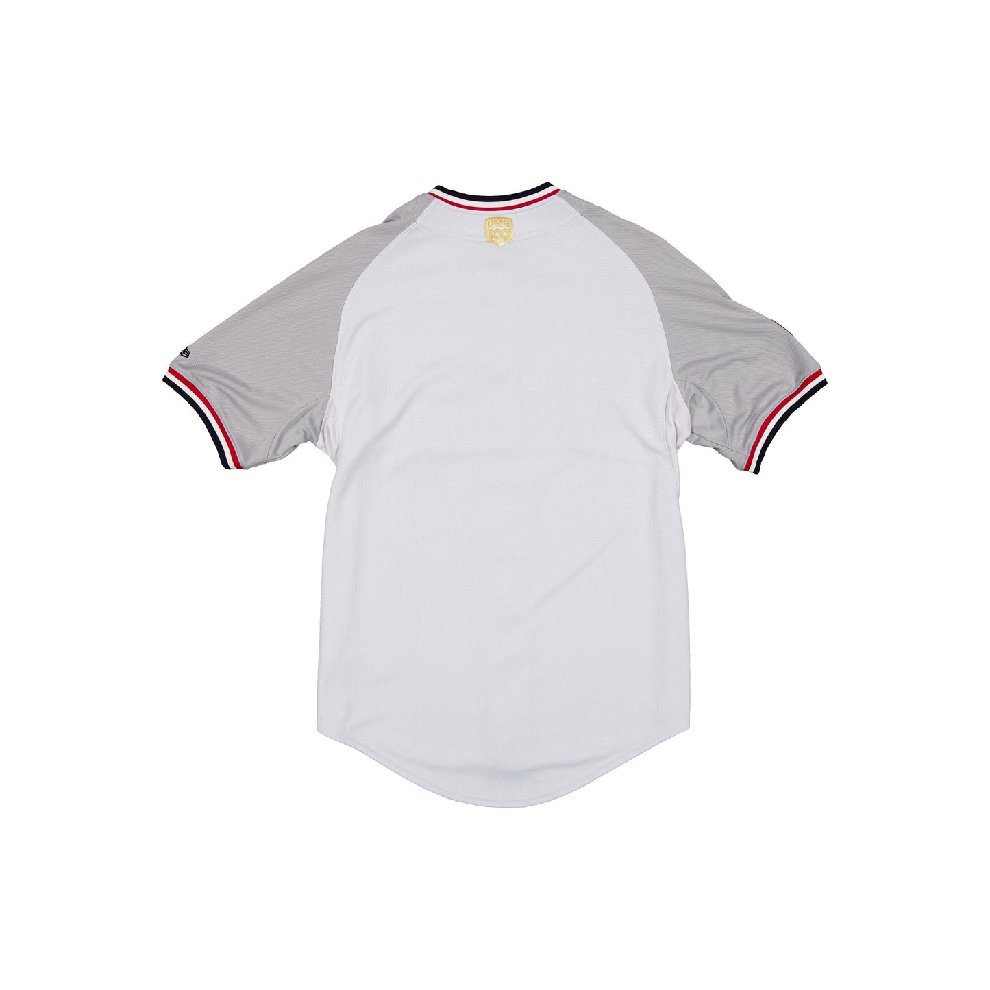 The Tecolotes de los Dos Laredos LMB 100th Anniversary Alt Jersey features an embroidered Dos Laredos wordmark at the chest with a New Era Official Merchandise patch at the front hemline, a team logo at the right sleeve, and a LMB 100th Anniversary logo at the rear.