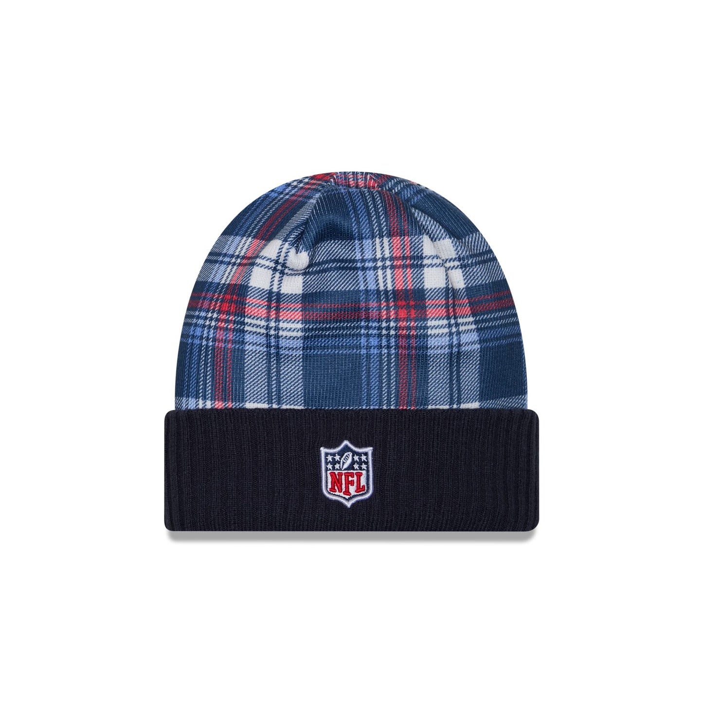 The Tennessee Titans 2024 Cold Weather Statement Knit Beanie features an embroidered Titans logo at the front cuff with a matching NFL Shield at the rear and a plaid print throughout the crown.