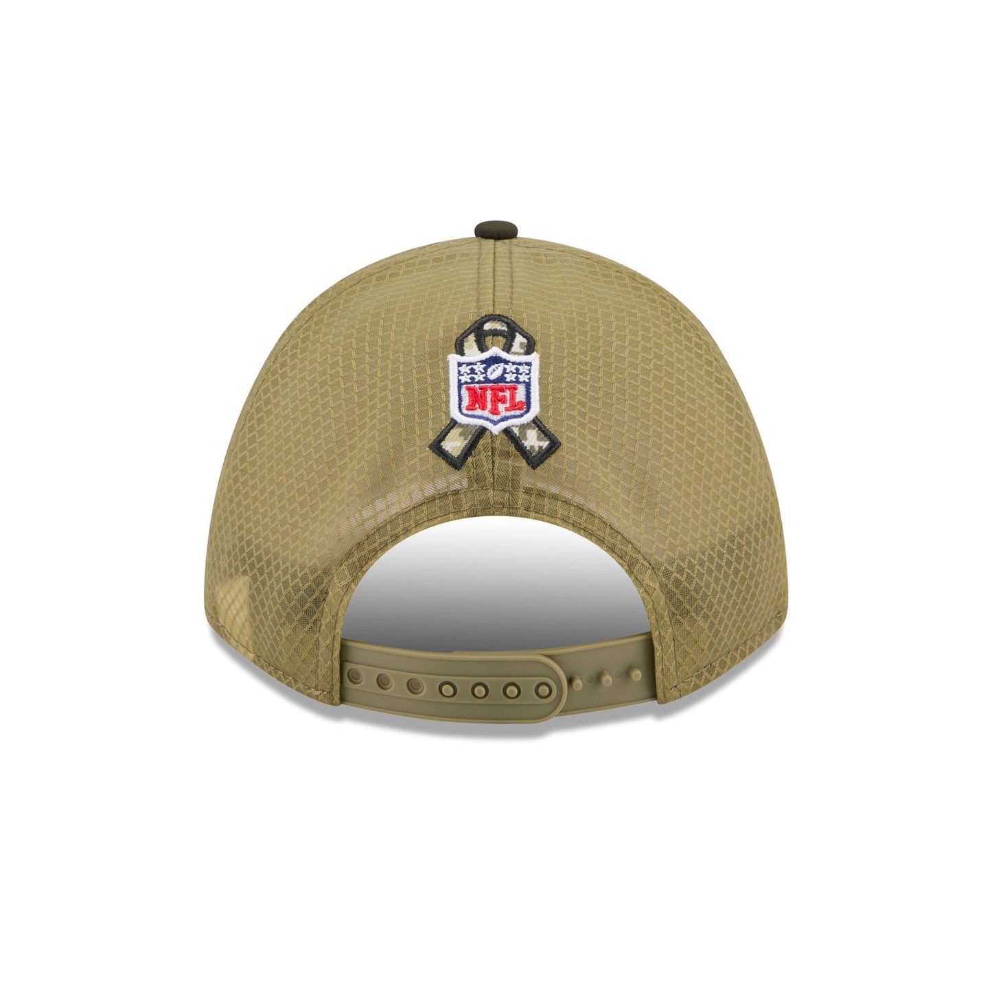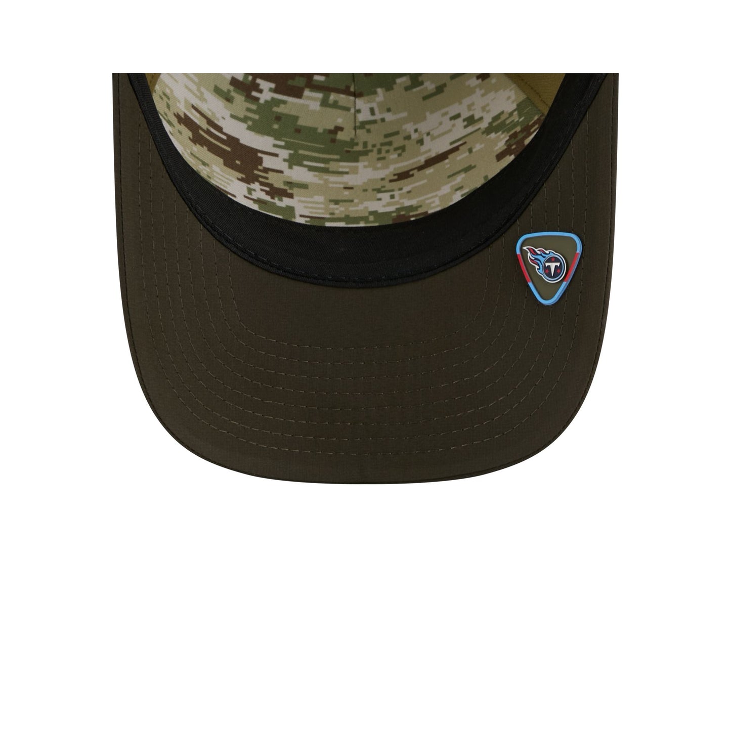 The Tennessee Titans 2025 Salute to Service 9FORTY M-Crown A-Frame Trucker features an embroidered Titans logo at the front panel with the official NFL Salute to Service patch above a snapback closure at the rear. Additional details include an American flag patch at the right-wear side with a silicone team logo patch at a dark green undervisor and a digi camo interior fabrication.
