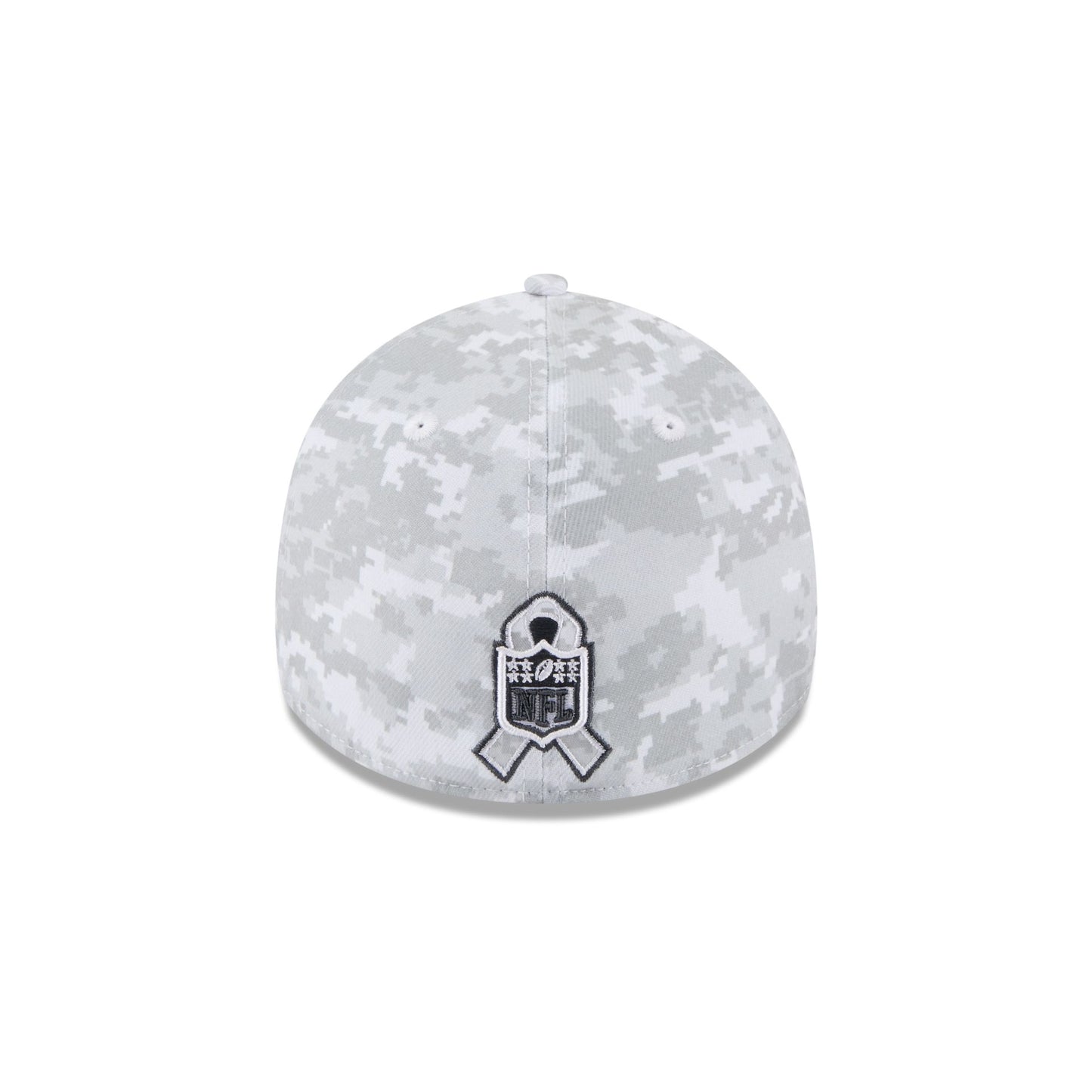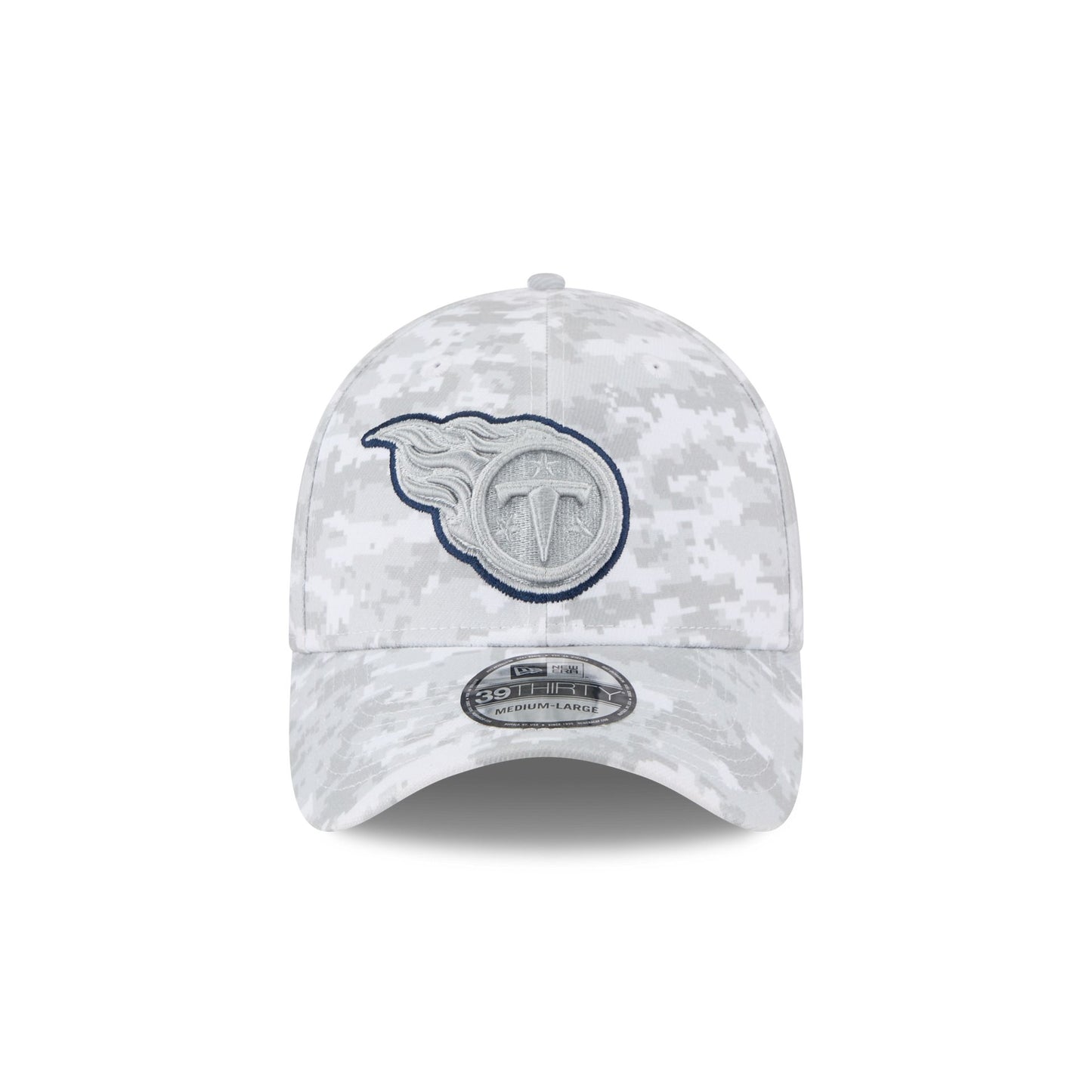 The Tennessee Titans 2025 Salute to Service Fan Gear 39THIRTY Stretch Fit Cap features an embroidered Titans logo at the front panels with the official NFL Salute to Service patch at the rear, an American flag patch at the right-wear side, and a team color undervisor.
