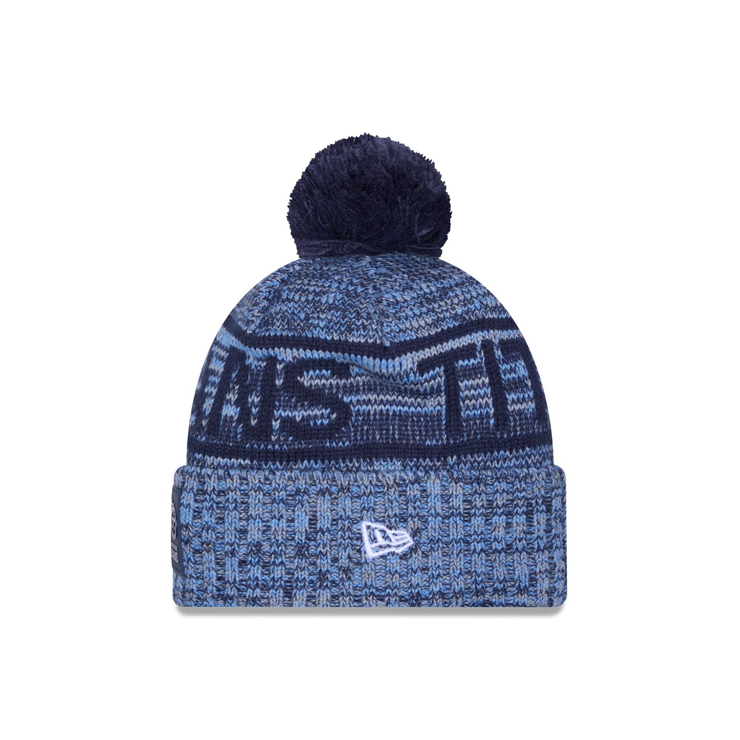 The Tennessee Titans 2025 Sideline Cold Weather Pom Knit Hat features a sewn-down silicone Titans logo patch at the front cuff with a matching Official NFL Shield logo at the rear. Additional details include a team wordmark across the crown, a one-time removeable pom, and a fleece lining.