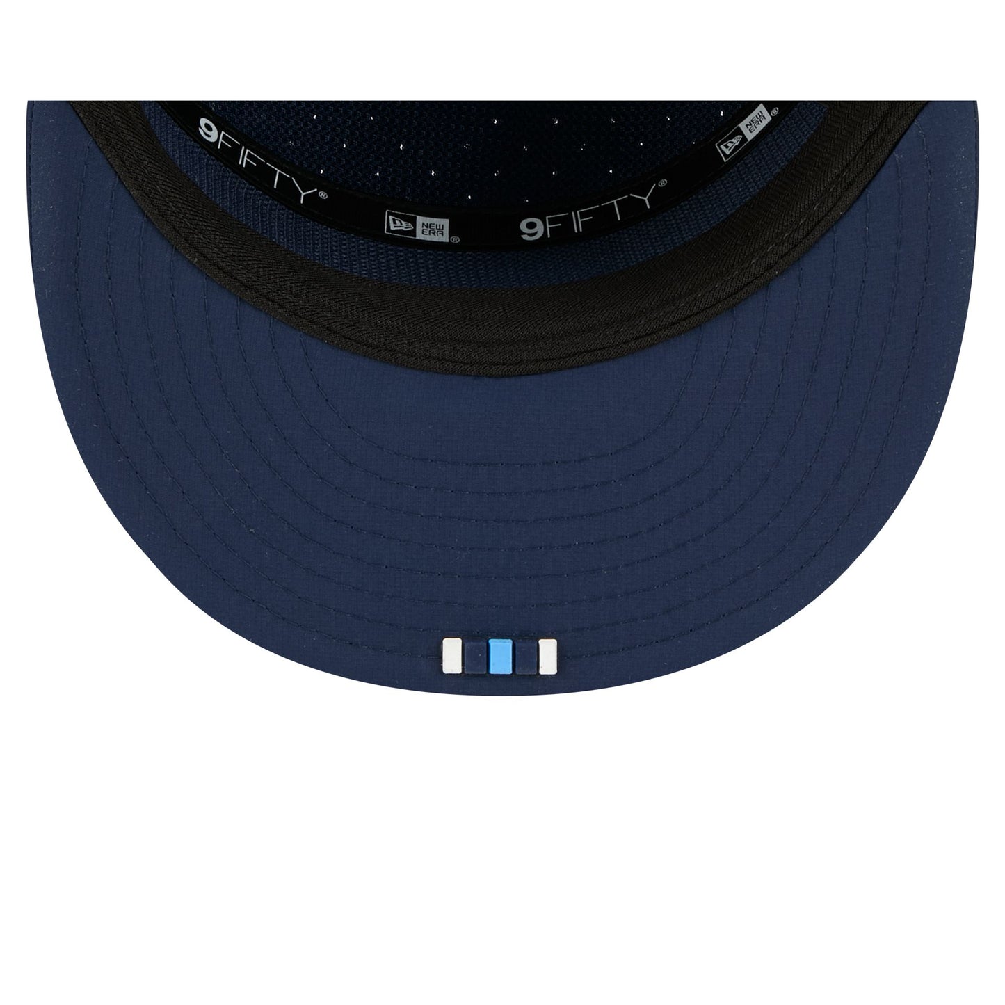 The Tennessee Titans 2025 Sideline Hot Weather Split Panel 9FIFTY Snapback features a sewn-down silicone Titans logo patch at the front panels with a split-crown construction. The cap has a water-repellent quill tech fabrication throughout, with a quick-dry cushioned sweatband to absorb moisture. Additional details include the Official NFL Shield logo to the right of a soft silicone snapback closure at the rear. The undervisor is accented with a silicone transfer in the team’s colors.