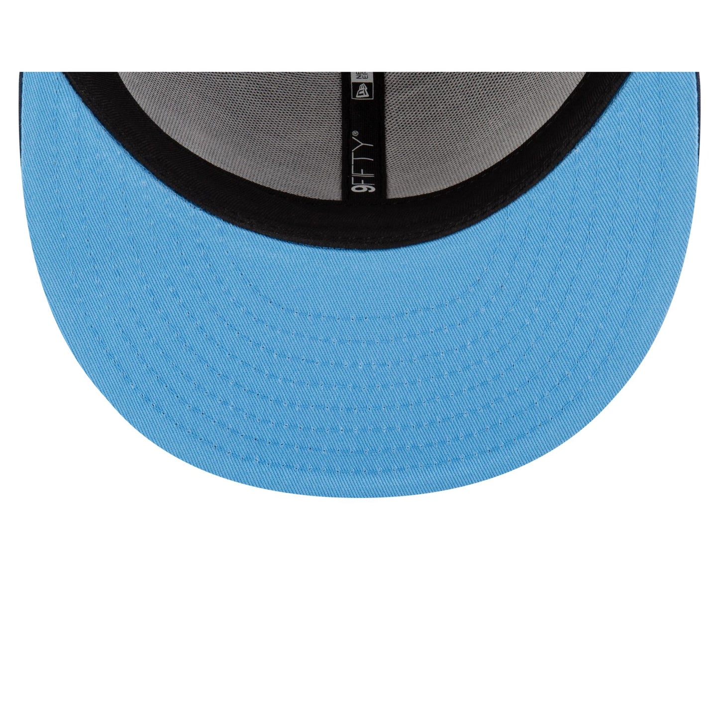 The Tennessee Titans Helmet Pack 9FIFTY Snapback features an embroidered fabric applique Titans replica helmet design at the crown with a matching woven team logo tag at an adjustable snapback closure at the rear and a blue undervisor.