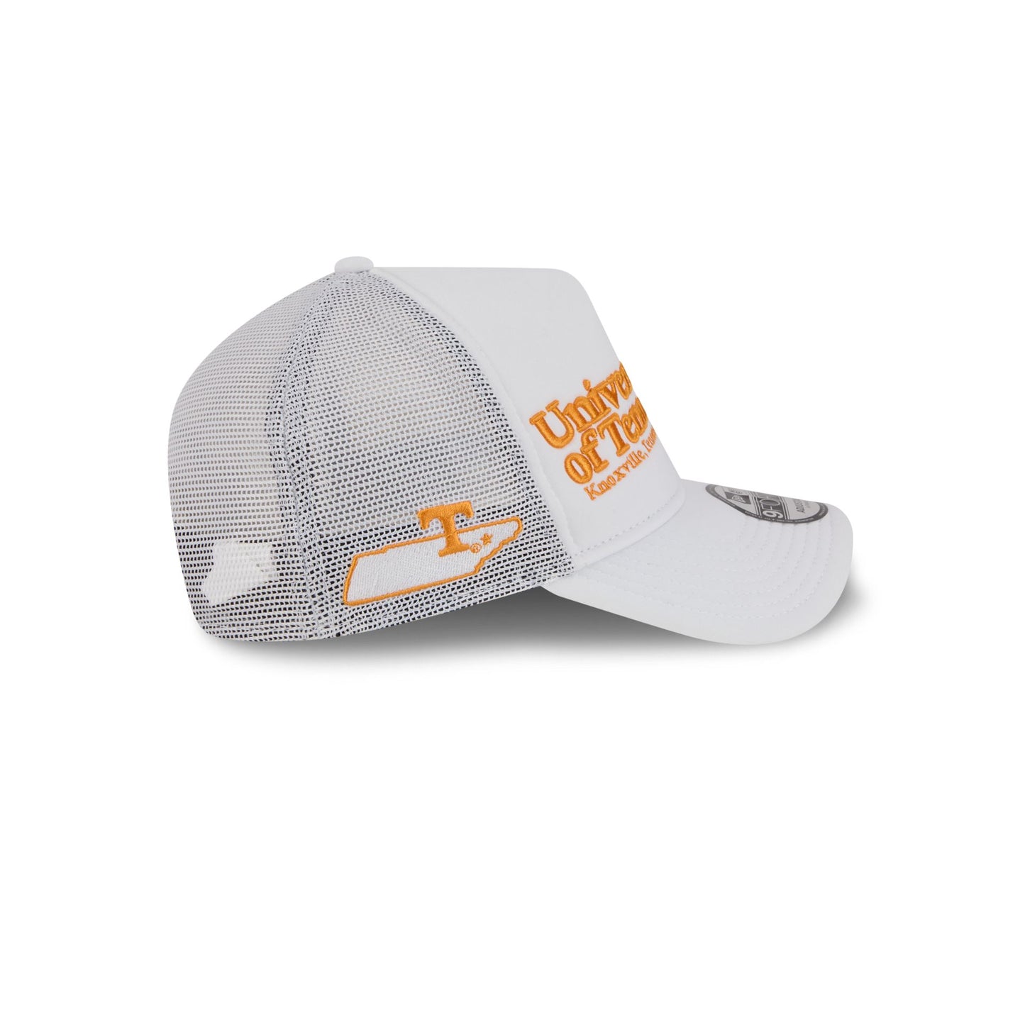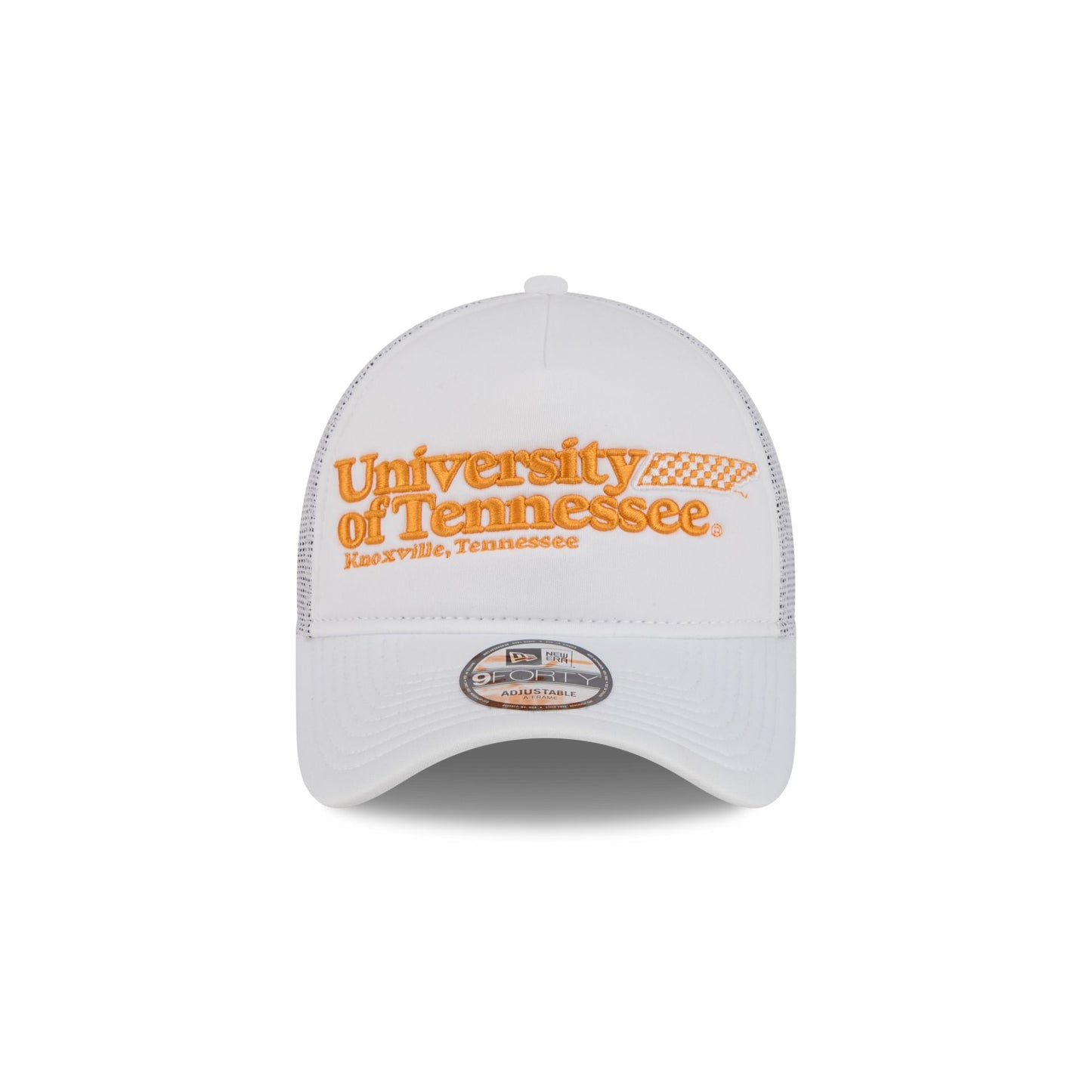 The Tennessee Volunteers Collegiate City, State 9FORTY A-Frame Trucker features an embroidered Volunteers wordmark and logo above a Knoxville, Tennessee school location wordmark at the front panel. Additional details include an alternate team logo and City, State patch at the right-wear side with an adjustable snapback closure at the rear and a green undervisor.