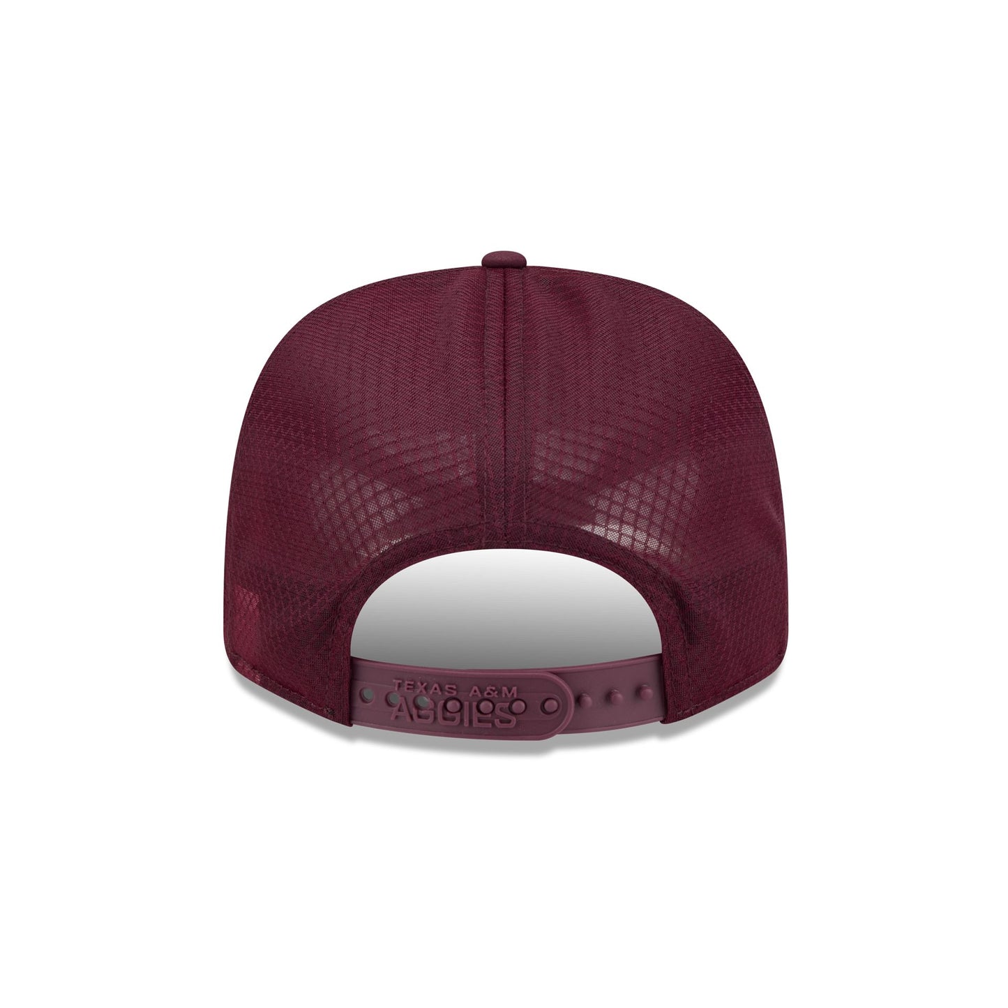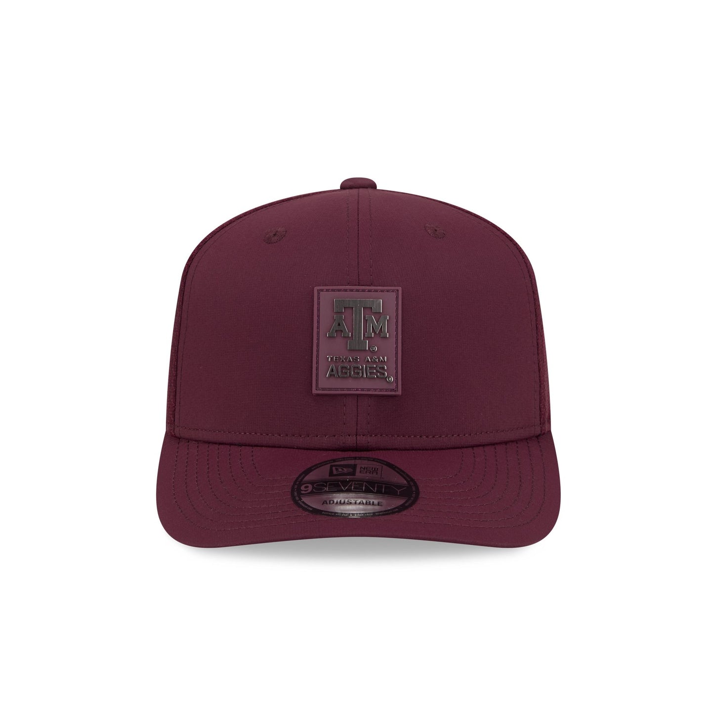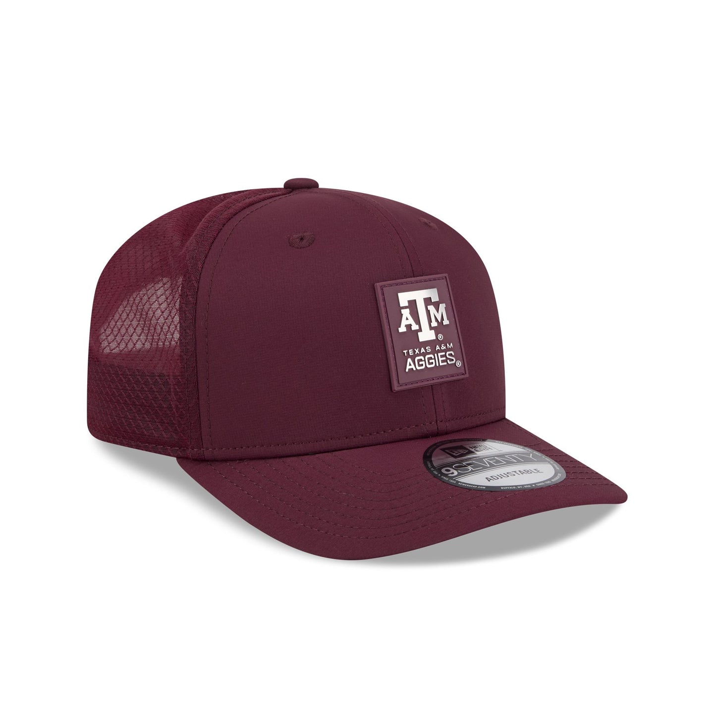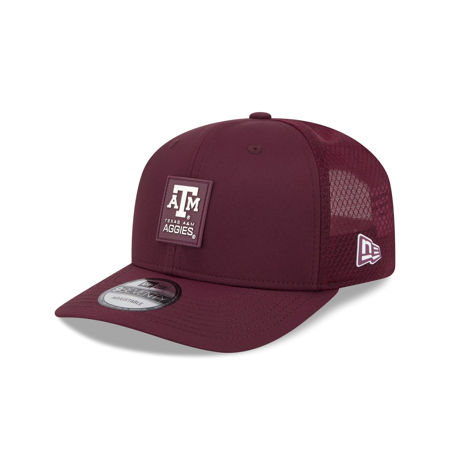 The Texas A&M Aggies Hot Weather 9SEVENTY Trucker features a sewn-down silicone Aggies logo patch at the front panels with a water-repellent quill tech fabrication throughout and a quick-dry cushioned sweatband to absorb moisture. Additional details include a team wordmark on a soft silicone snapback closure at a light-weight mesh rear with team color silicone transfer details at the undervisor.