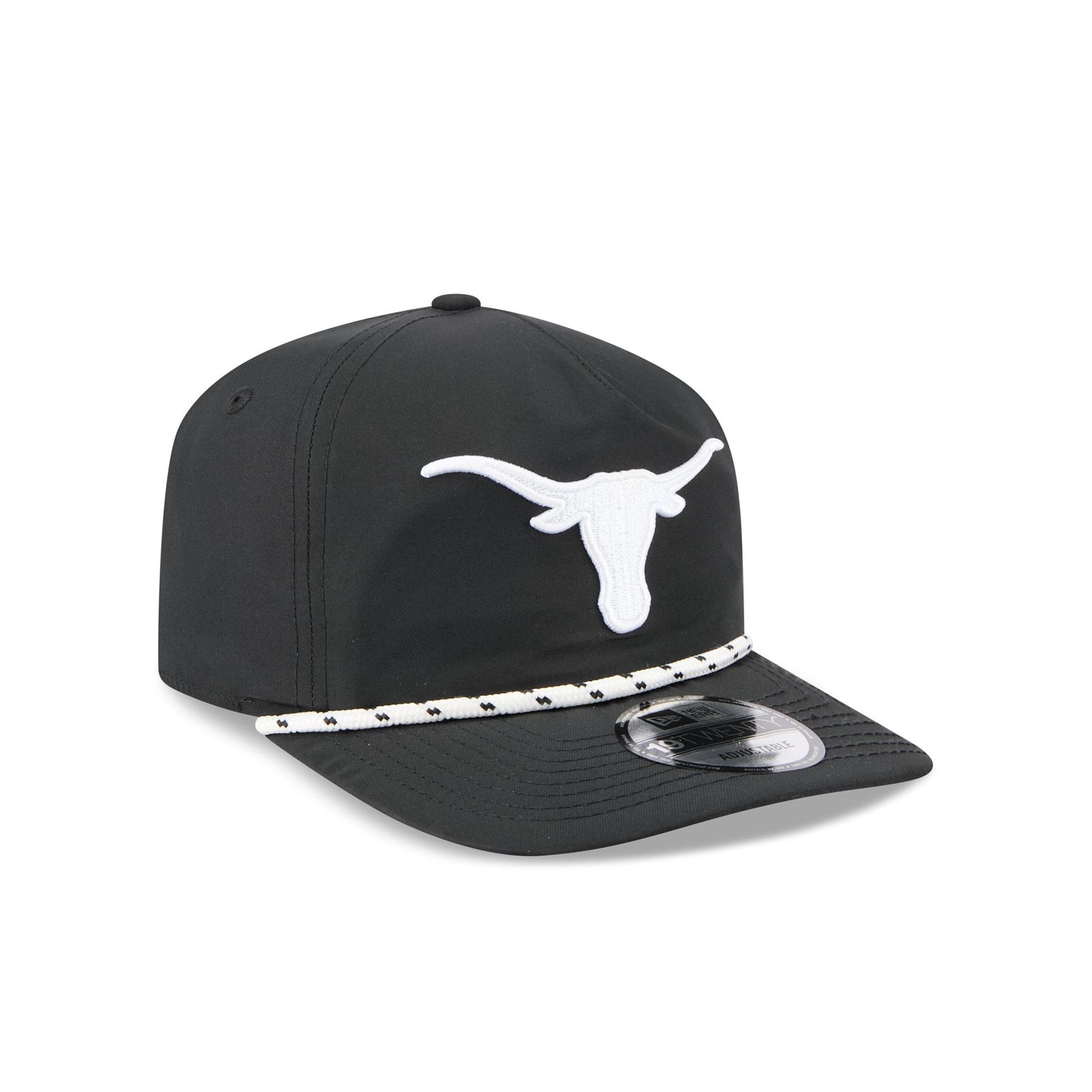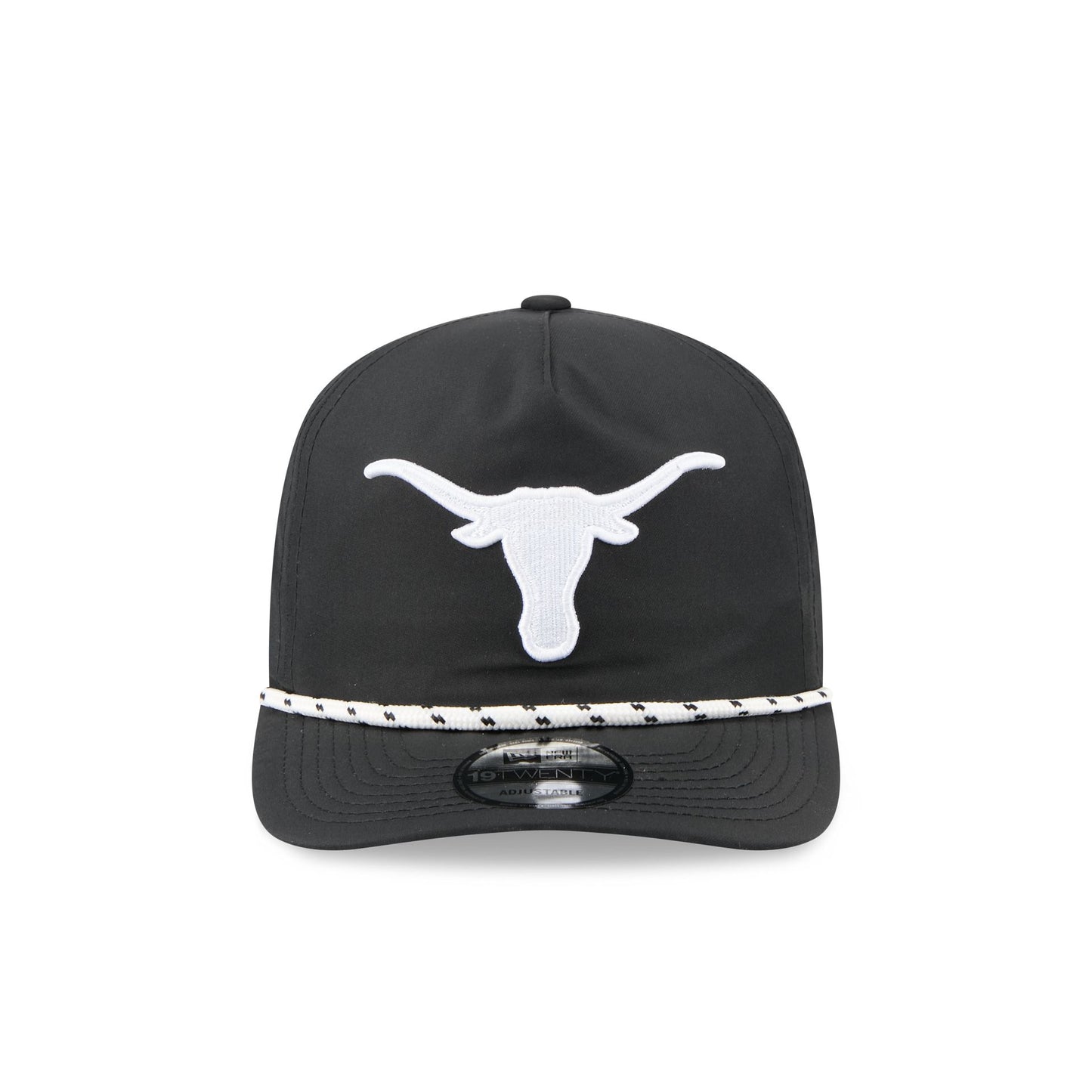 The Texas Longhorns Black and White Rope 19TWENTY Snapback features an embroidered Longhorns logo and rope at the front with a snapback closure at the rear and a gray undervisor.