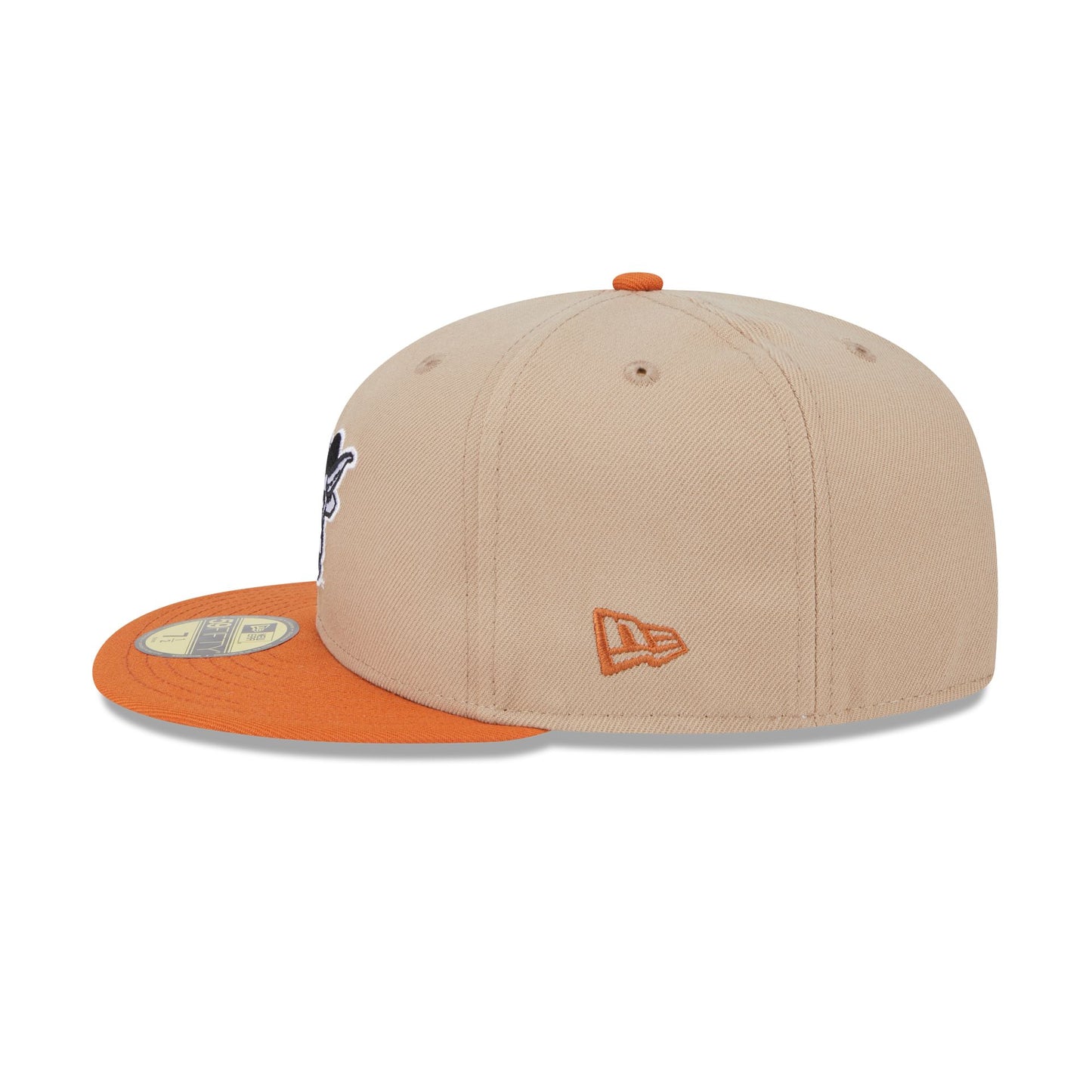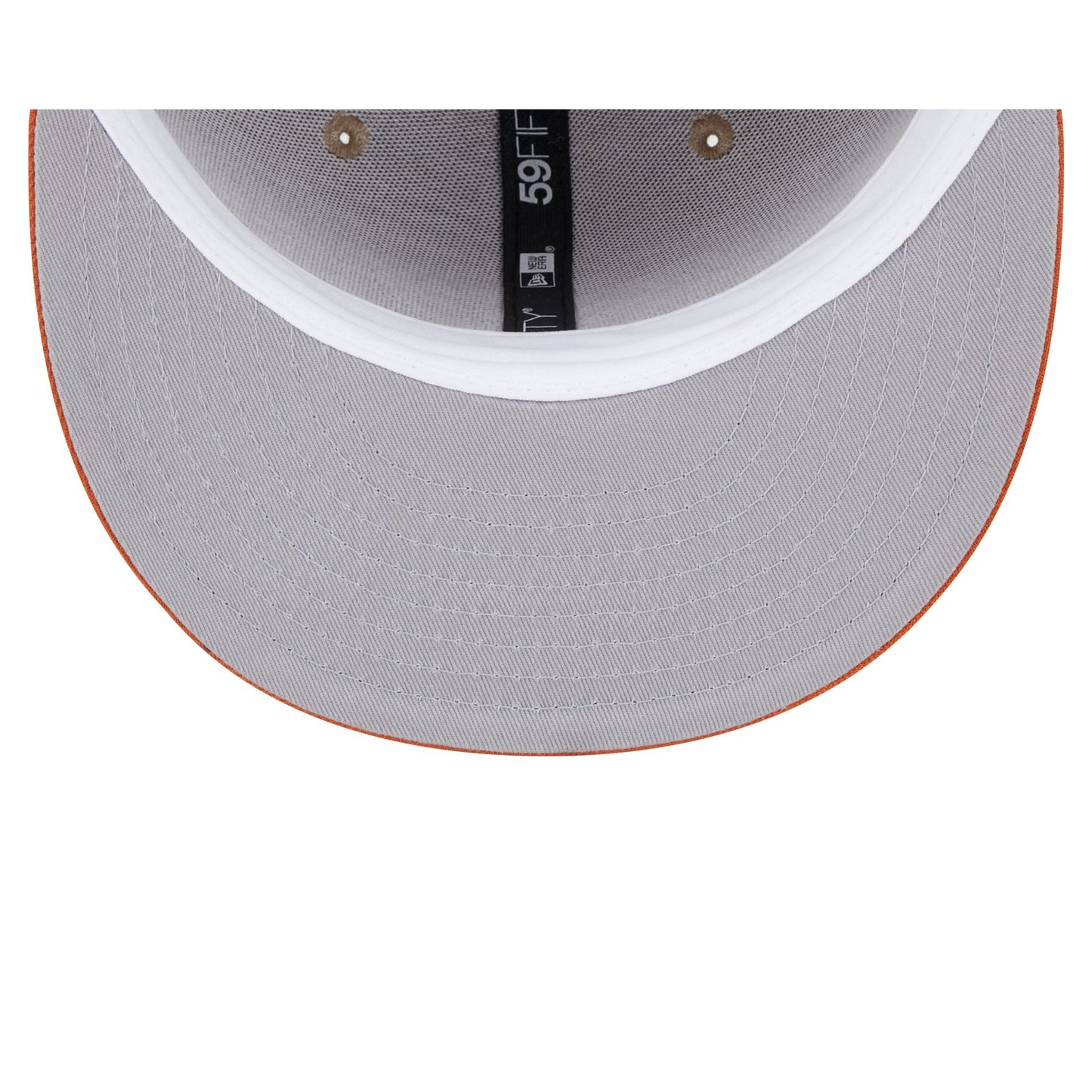 The Texas Longhorns Camel College Vault 59FIFTY Fitted Cap features an embroidered Longhorns logo at the front panels with a matching team wordmark at the rear and a gray undervisor.