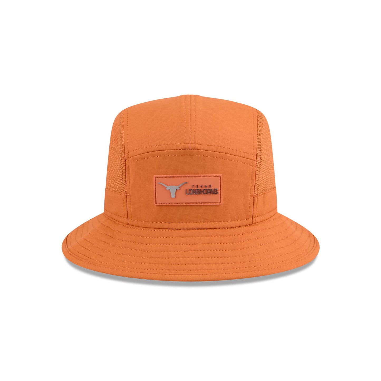 The Texas Longhorns Hot Weather Stretch Bucket features a sewn-down silicone Longhorns logo patch at the front with breathable mesh side panels and an adjustable reflective drawstring at the rear.