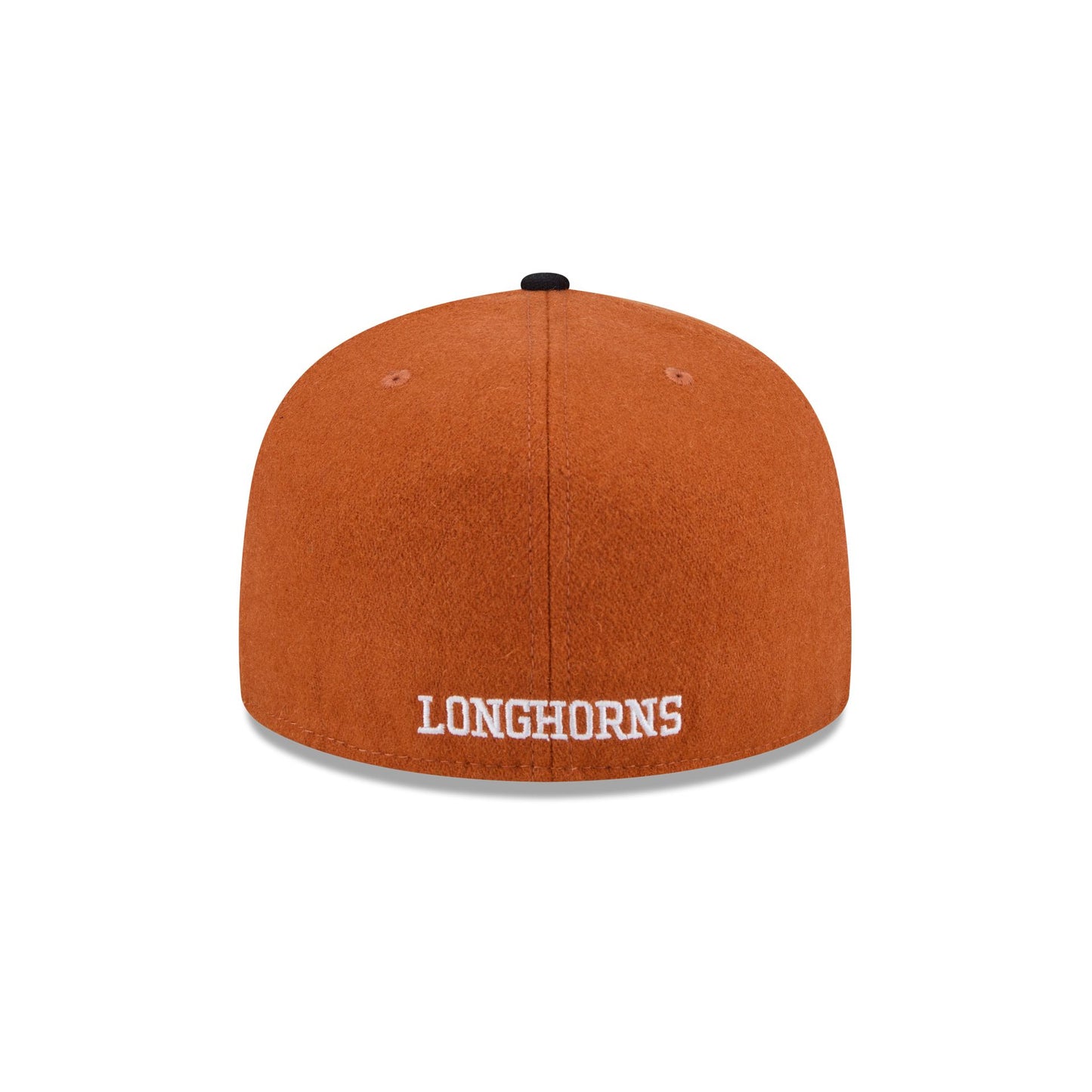The Texas Longhorns Melton Wool 59FIFTY Fitted Cap features a chenille applique Longhorns logo patch at the front panels with an embroidered team wordmark at the rear and a gray undervisor.