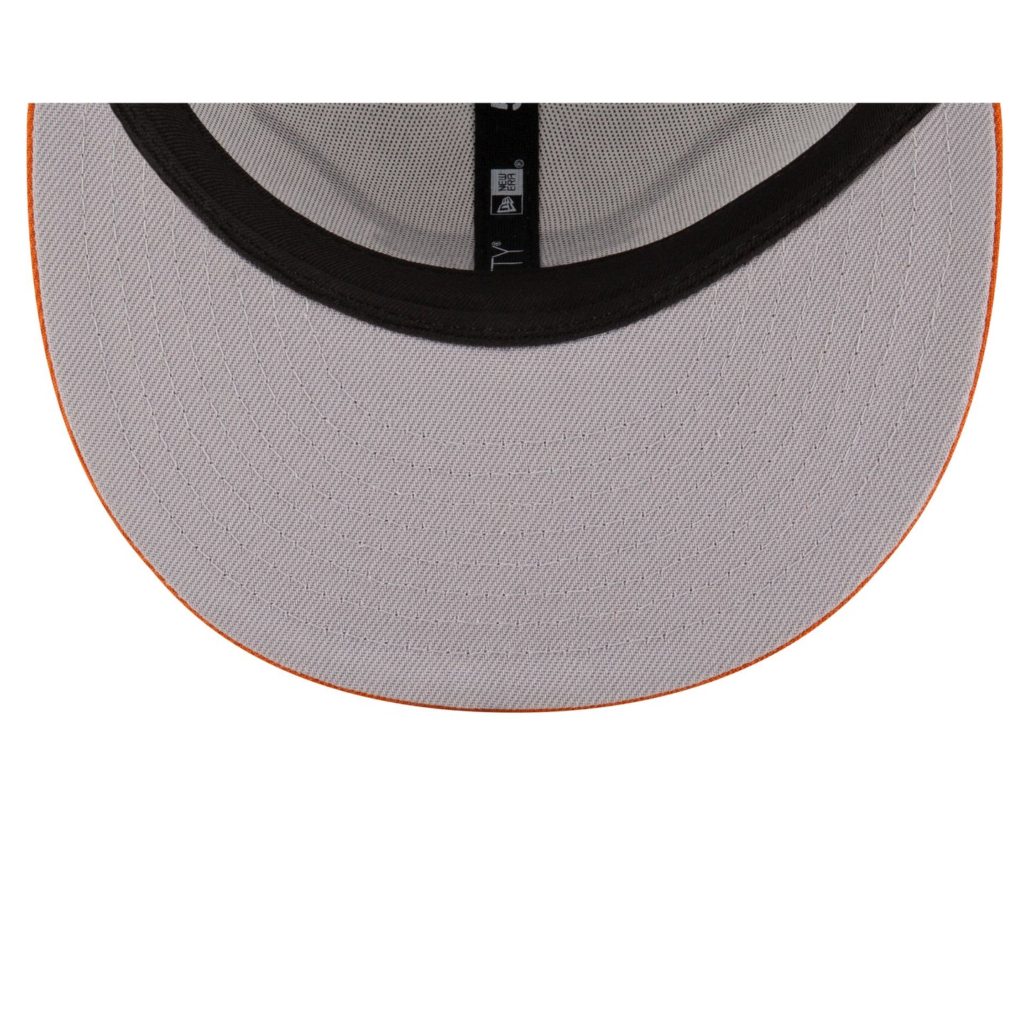 The Texas Longhorns White 59FIFTY Fitted Cap features an embroidered Longhorns logo at the front panels with a matching team wordmark at the rear. Additional details include a 2005 National Champions patch at the right-wear side, an orange visor, and a gray undervisor.